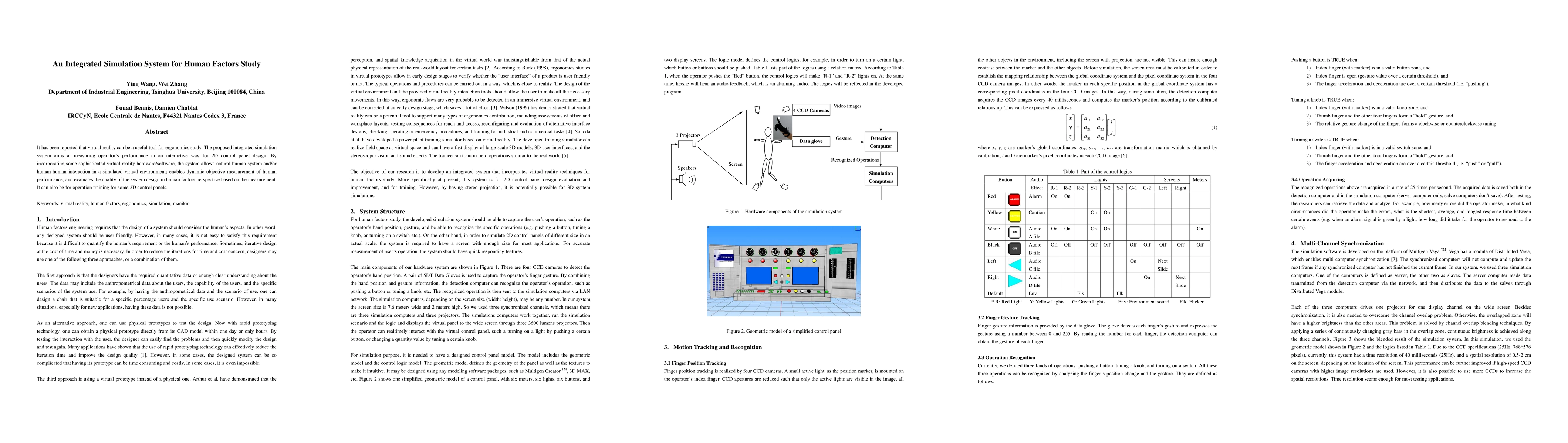 It has been reported that virtual reality can be a useful tool for ergonomics study. The proposed integrated simulation system aims at measuring operator's performance in an interactive way for 2D control panel design. By incorporating some sophisticated virtual reality hardware/software, the system allows natural human-system and/or human-human interaction in a simulated virtual environment; enables dynamic objective measurement of human performance; and evaluates the quality of the system design in human factors perspective based on the measurement. It can also be for operation training for some 2D control panels.