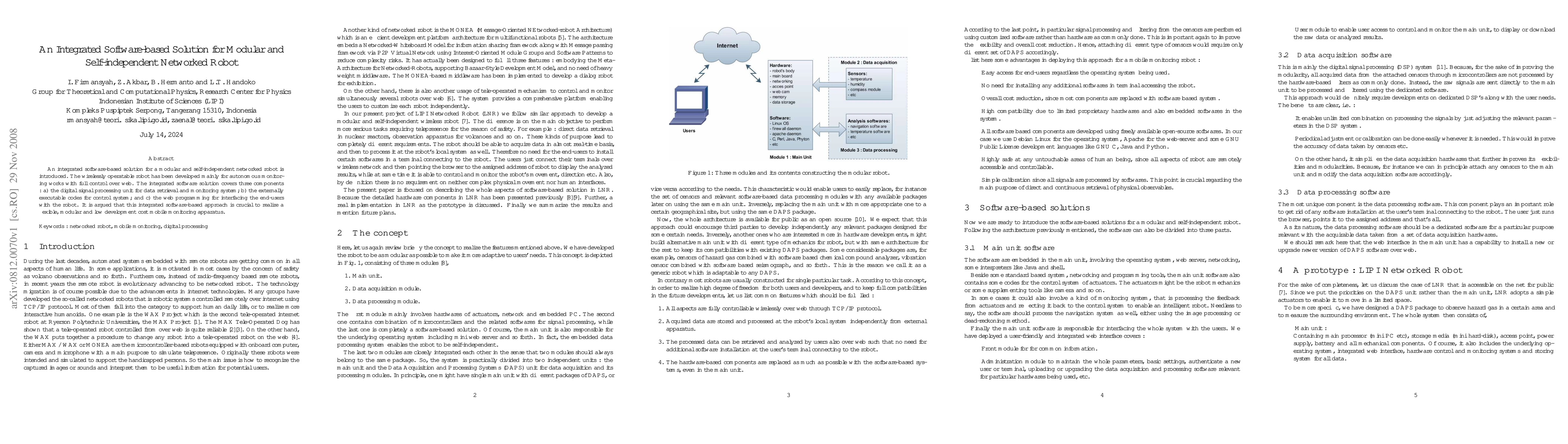 An integrated software-based solution for a modular and self-independent networked robot is introduced. The wirelessly operatable robot has been developed mainly for autonomous monitoring works with full control over web. The integrated software solution covers three components : a) the digital signal processing unit for data retrieval and monitoring system; b) the externally executable codes for control system; and c) the web programming for interfacing the end-users with the robot. It is argued that this integrated software-based approach is crucial to realize a flexible, modular and low development cost mobile monitoring apparatus.