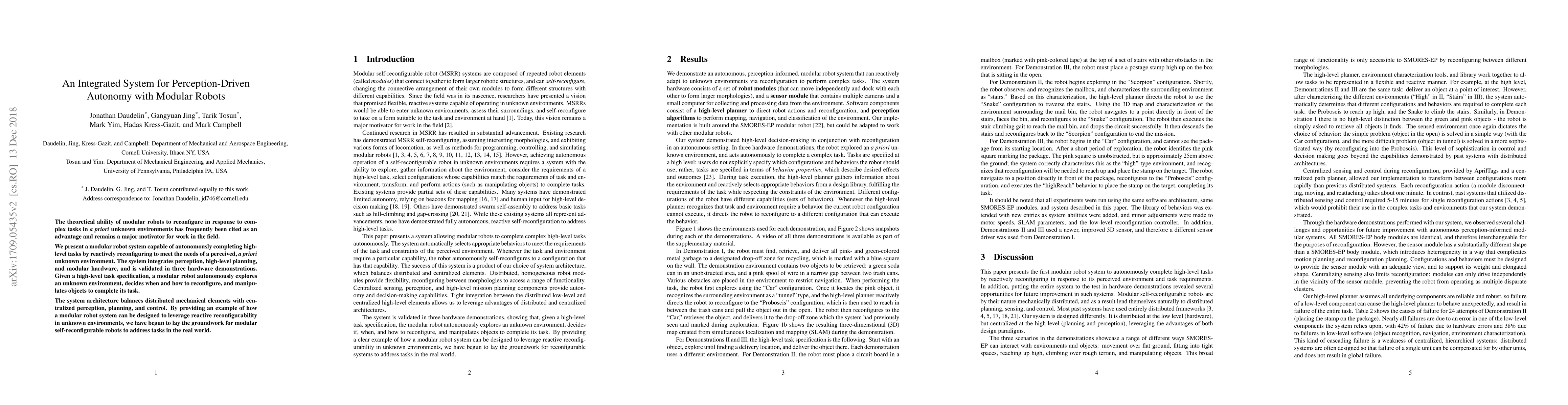 This paper presents a modular robot system that autonomously completes high-level tasks by dynamically reconfiguring in response to unknown environments. The system integrates perception, planning, and modular hardware, demonstrating its ability to explore, reconfigure, and manipulate objects.