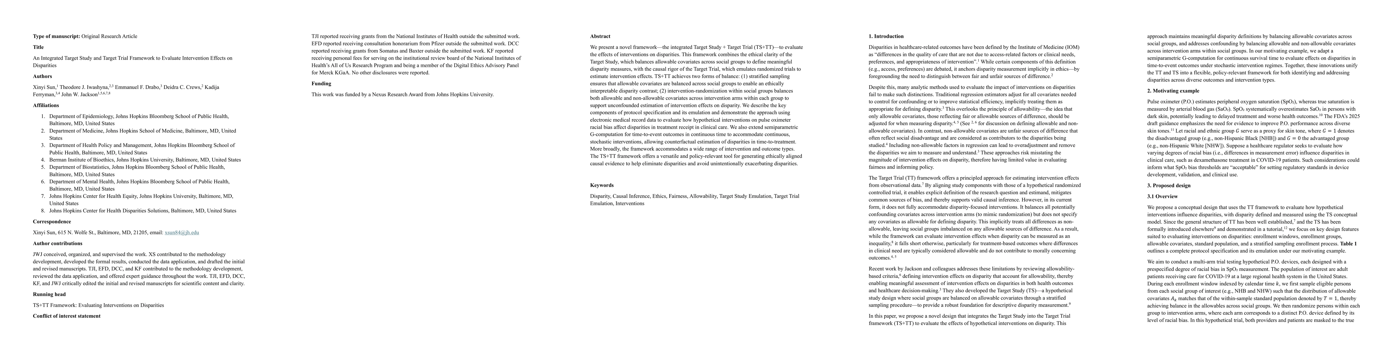 The research introduces an integrated Target Study + Target Trial (TS+TT) framework to evaluate intervention effects on disparities, combining ethical clarity of Target Study with causal rigor of Target Trial, ensuring balance in allowable and non-allowable covariates across social groups.