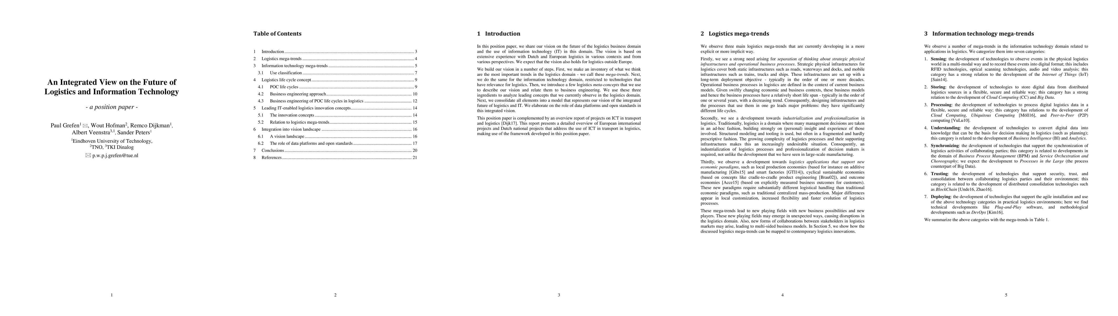 In this position paper, we present our vision on the future of the logistics business domain and the use of information technology (IT) in this domain. The vision is based on extensive experience with Dutch and European logistics in various contexts and from various perspectives. We expect that the vision also holds for logistics outside Europe. We build our vision in a number of steps. First, we make an inventory of the most important trends in the logistics domain - we call these mega-trends. Next, we do the same for the information technology domain, restricted to technologies that have relevance for logistics. Then, we introduce logistics meta-concepts that we use to describe our vision and relate them to business engineering. We use these three ingredients to analyze leading concepts that we currently observe in the logistics domain. Next, we consolidate all elements into a model that represents our vision of the integrated future of logistics and IT. We elaborate on the role of data platforms and open standards in this integrated vision.