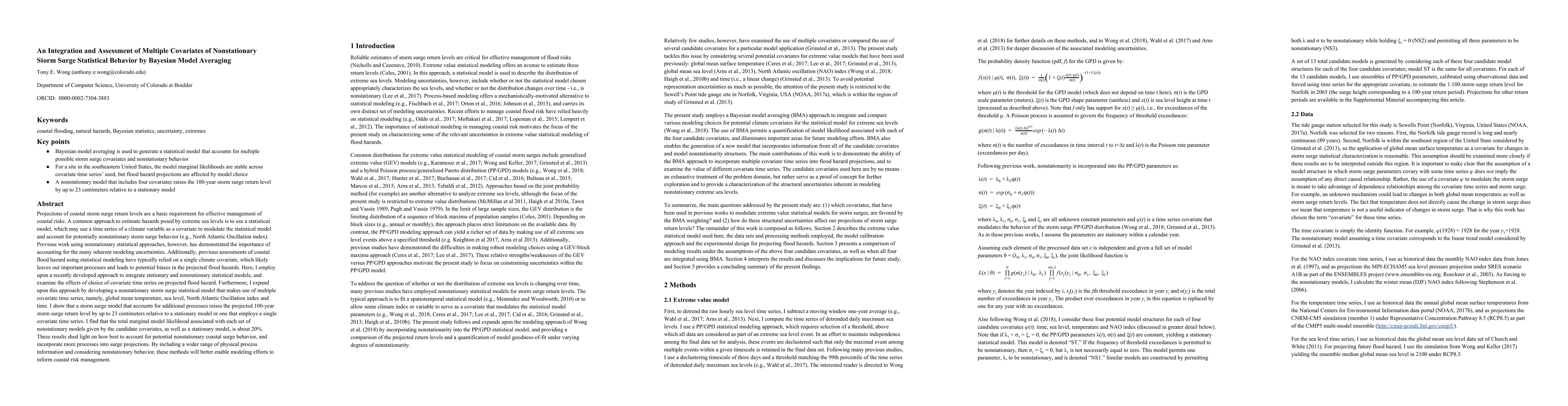 Projections of storm surge return levels are a basic requirement for effective management of coastal risks. A common approach to estimate hazards posed by extreme sea levels is to use a statistical model, which may use a time series of a climate variable as a covariate to modulate the statistical model and account for potentially nonstationary storm surge behavior. Previous work using nonstationary statistical approaches, however, has demonstrated the importance of accounting for the many inherent modeling uncertainties. Additionally, previous assessments of coastal flood hazard using statistical modeling have typically relied on a single climate covariate, which likely leaves out important processes and leads to potential biases. Here, I employ upon a recently developed approach to integrate stationary and nonstationary statistical models, and examine the effects of choice of covariate time series on projected flood hazard. Furthermore, I expand upon this approach by developing a nonstationary storm surge statistical model that makes use of multiple covariate time series: global mean temperature, sea level, North Atlantic Oscillation index and time. I show that a storm surge model that accounts for additional processes raises the projected 100-year storm surge return level by up to 23 centimeters relative to a stationary model or one that employs a single covariate time series. I find that the total marginal model likelihood associated with each set of nonstationary models given by the candidate covariates, as well as a stationary model, is about 20%. These results shed light on how best to account for potential nonstationary coastal surge behavior, and incorporate more processes into surge projections. By including a wider range of physical process information and considering nonstationary behavior, these methods will better enable modeling efforts to inform coastal risk management.