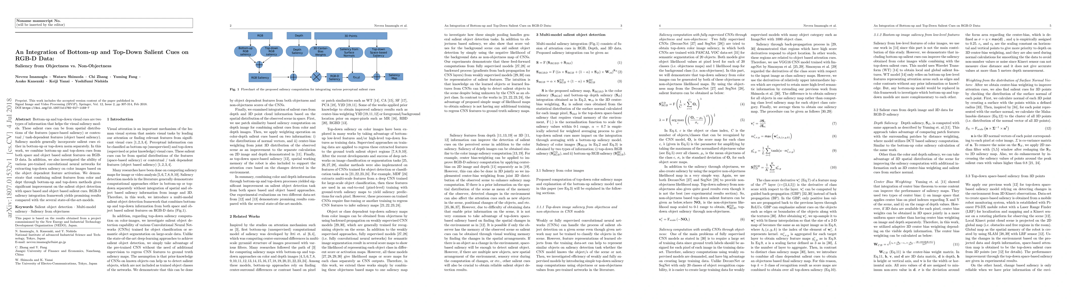 This paper integrates bottom-up and top-down salient cues from both spatial and object-based features in RGB-D data, showing significant improvement in salient object detection. The study also evaluates the effectiveness of various pre-trained CNNs for top-down saliency extraction, demonstrating superior performance over state-of-the-art models.