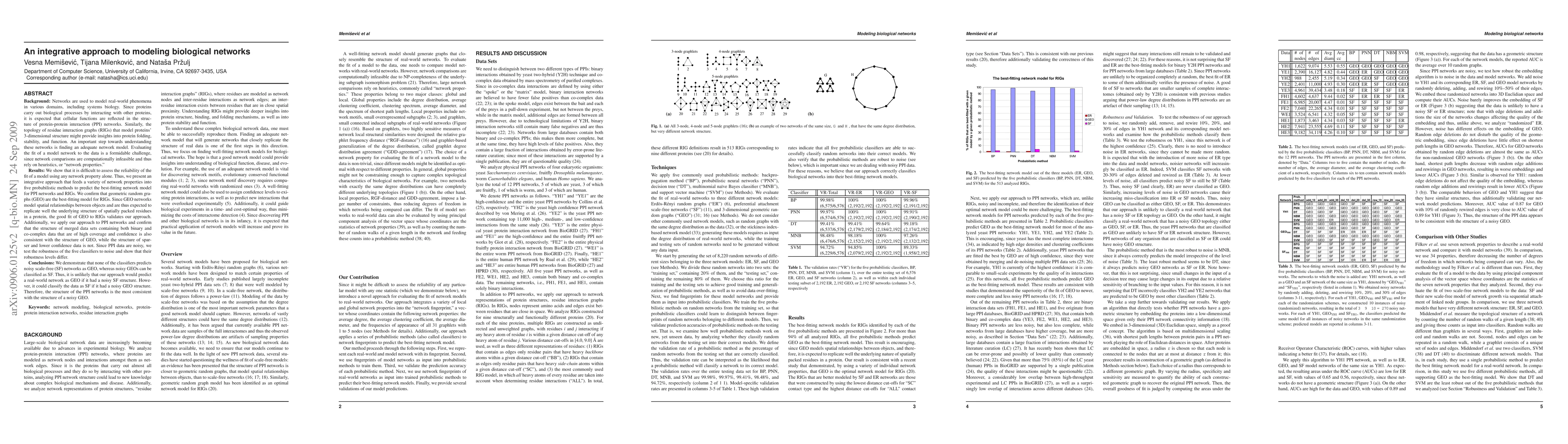 This paper proposes an integrative method to model biological networks by combining multiple network properties with probabilistic techniques to identify the best-fitting model. The authors find geometric random graphs to be the most suitable model for residue interaction graphs and noisy protein-protein interaction networks, validating the effectiveness of their approach.