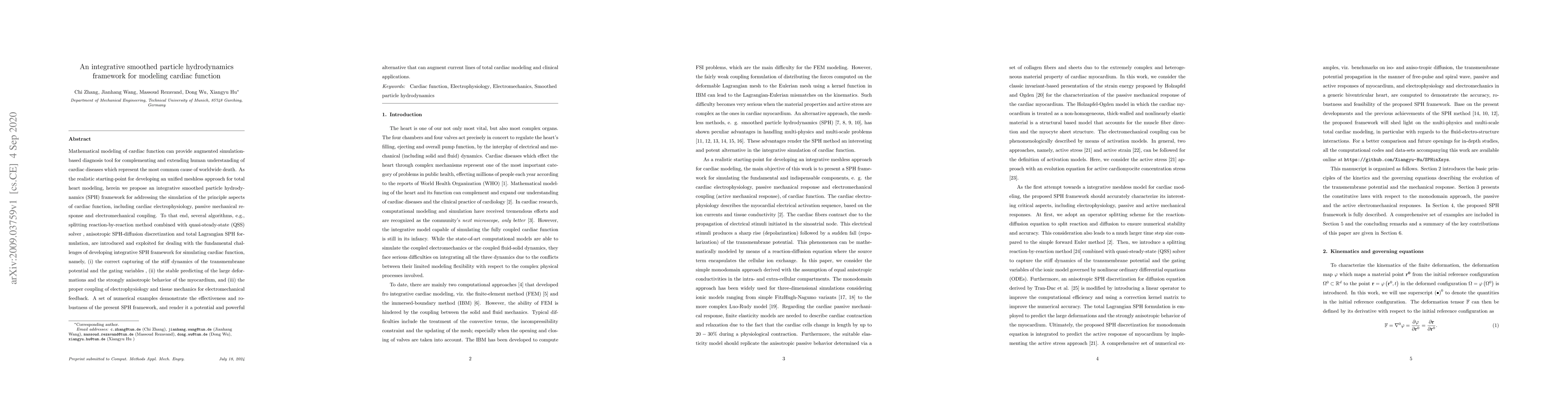 This paper proposes an integrative smoothed particle hydrodynamics (SPH) framework for modeling cardiac function, addressing electrophysiology, mechanical response, and electromechanical coupling. The framework employs various algorithms to tackle challenges in capturing dynamic cardiac processes, predicting myocardial deformations, and coupling electrophysiology with mechanics, demonstrating its potential as a robust alternative for cardiac modeling and clinical applications.