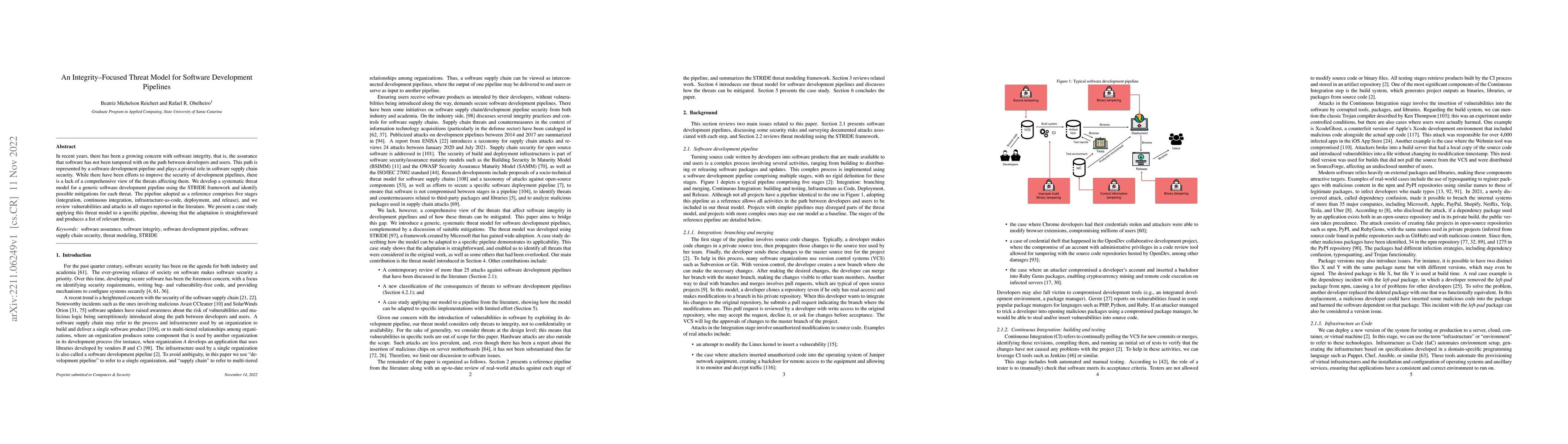 This paper develops a systematic threat model for software development pipelines using the STRIDE framework to identify and mitigate threats across five stages: integration, continuous integration, infrastructure-as-code, deployment, and release. It demonstrates the model's application through a case study, highlighting its effectiveness in identifying relevant threats.