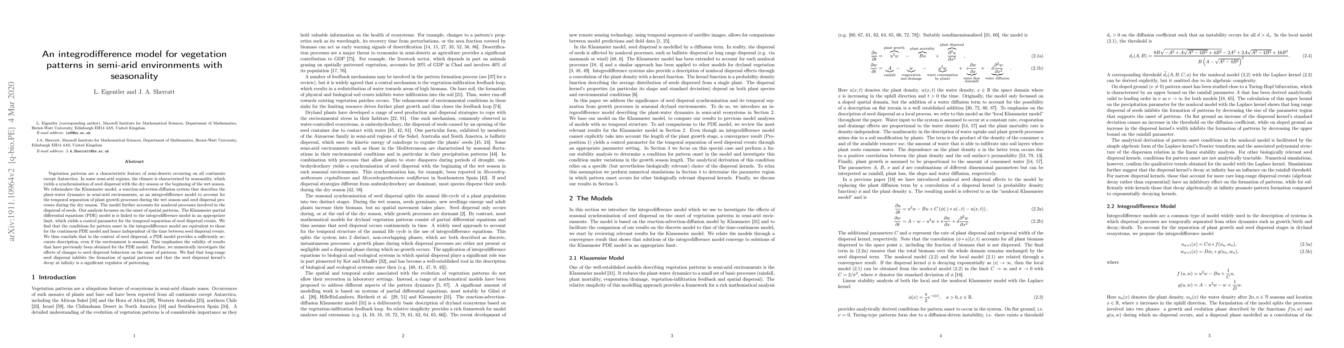 Vegetation patterns are a characteristic feature of semi-deserts occurring on all continents except Antarctica. In some semi-arid regions, the climate is characterised by seasonality, which yields a synchronisation of seed dispersal with the dry season or the beginning of the wet season. We reformulate the Klausmeier model, a reaction-advection-diffusion system that describes the plant-water dynamics in semi-arid environments, as an integrodifference model to account for the temporal separation of plant growth processes during the wet season and seed dispersal processes during the dry season. The model further accounts for nonlocal processes involved in the dispersal of seeds. Our analysis focusses on the onset of spatial patterns. The Klausmeier partial differential equations (PDE) model is linked to the integrodifference model in an appropriate limit, which yields a control parameter for the temporal separation of seed dispersal events. We find that the conditions for pattern onset in the integrodifference model are equivalent to those for the continuous PDE model and hence independent of the time between seed dispersal events. We thus conclude that in the context of seed dispersal, a PDE model provides a sufficiently accurate description, even if the environment is seasonal. This emphasises the validity of results that have previously been obtained for the PDE model. Further, we numerically investigate the effects of changes to seed dispersal behaviour on the onset of patterns. We find that long-range seed dispersal inhibits the formation of spatial patterns and that the seed dispersal kernel's decay at infinity is a significant regulator of patterning.