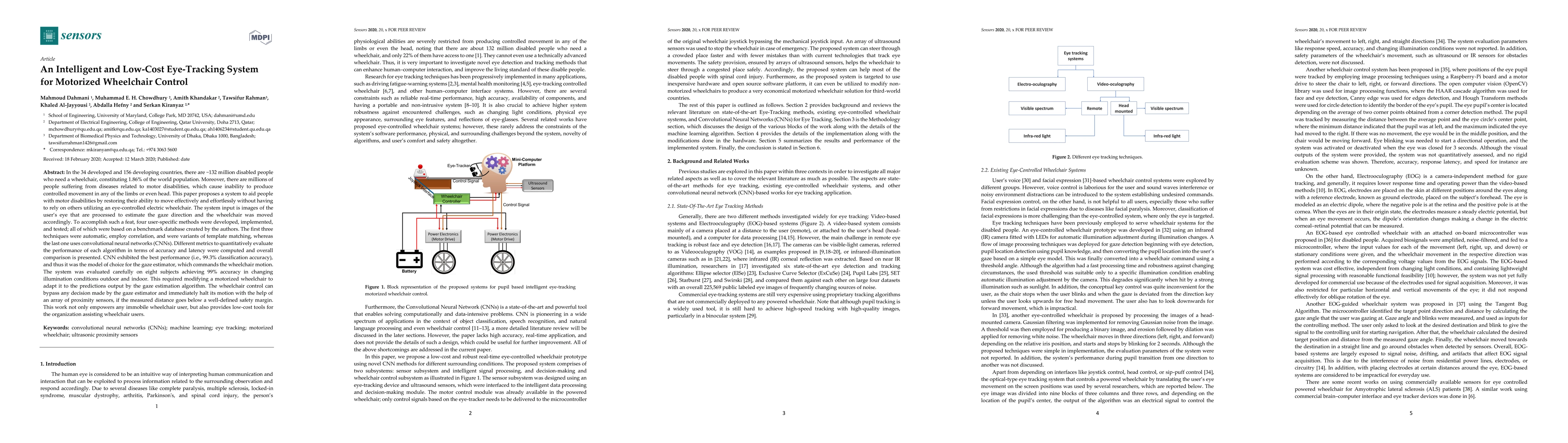 This paper proposes an intelligent and low-cost eye-tracking system to control a motorized wheelchair for individuals with motor disabilities. The system uses convolutional neural networks to achieve 99.3% accuracy in gaze estimation, enabling effective wheelchair navigation with minimal human assistance.