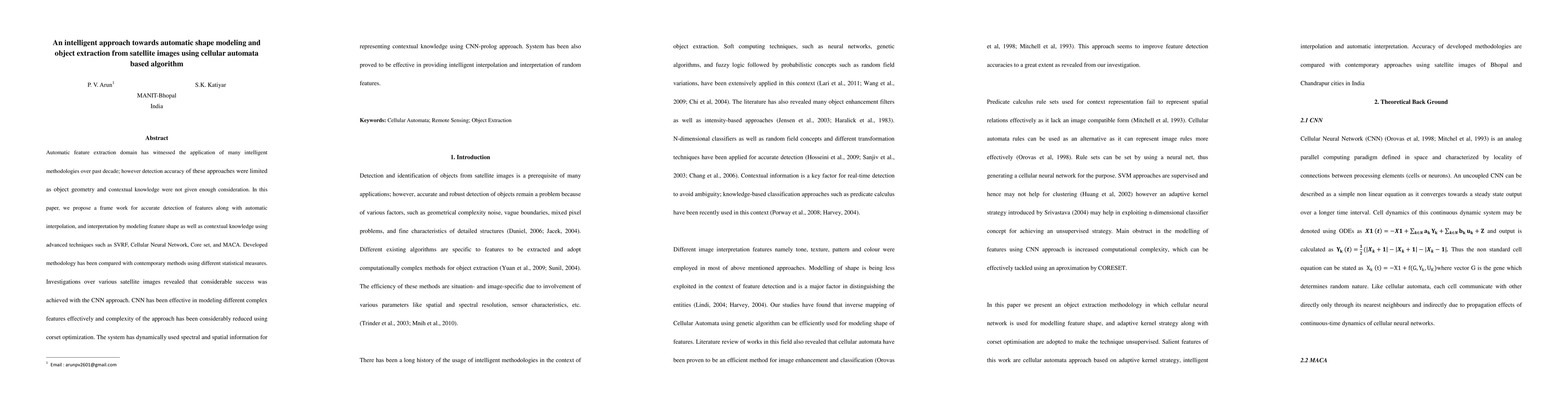 This paper proposes a framework for automatic shape modeling and object extraction from satellite images using a cellular automata-based algorithm, incorporating advanced techniques like SVRF, Cellular Neural Networks, Core set, and MACA. The methodology demonstrates significant success in detecting features and contextual knowledge, outperforming contemporary methods through dynamic use of spectral and spatial information.
