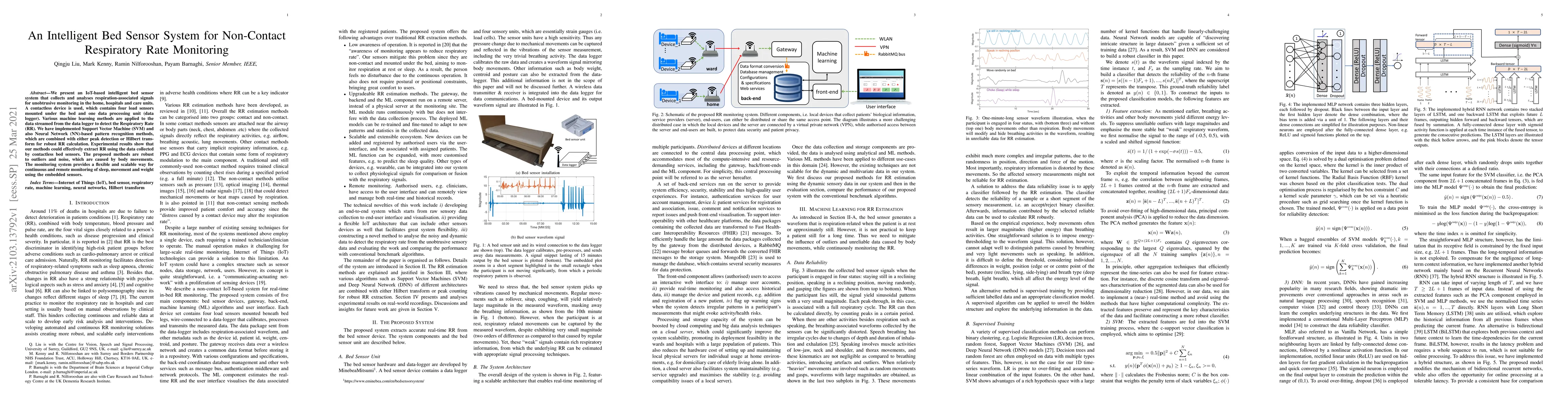 We present an IoT-based intelligent bed sensor system that collects and analyses respiration-associated signals for unobtrusive monitoring in the home, hospitals and care units. A contactless device is used, which contains four load sensors mounted under the bed and one data processing unit (data logger). Various machine learning methods are applied to the data streamed from the data logger to detect the Respiratory Rate (RR). We have implemented Support Vector Machine (SVM) and also Neural Network (NN)-based pattern recognition methods, which are combined with either peak detection or Hilbert transform for robust RR calculation. Experimental results show that our methods could effectively extract RR using the data collected by contactless bed sensors. The proposed methods are robust to outliers and noise, which are caused by body movements. The monitoring system provides a flexible and scalable way for continuous and remote monitoring of sleep, movement and weight using the embedded sensors.
