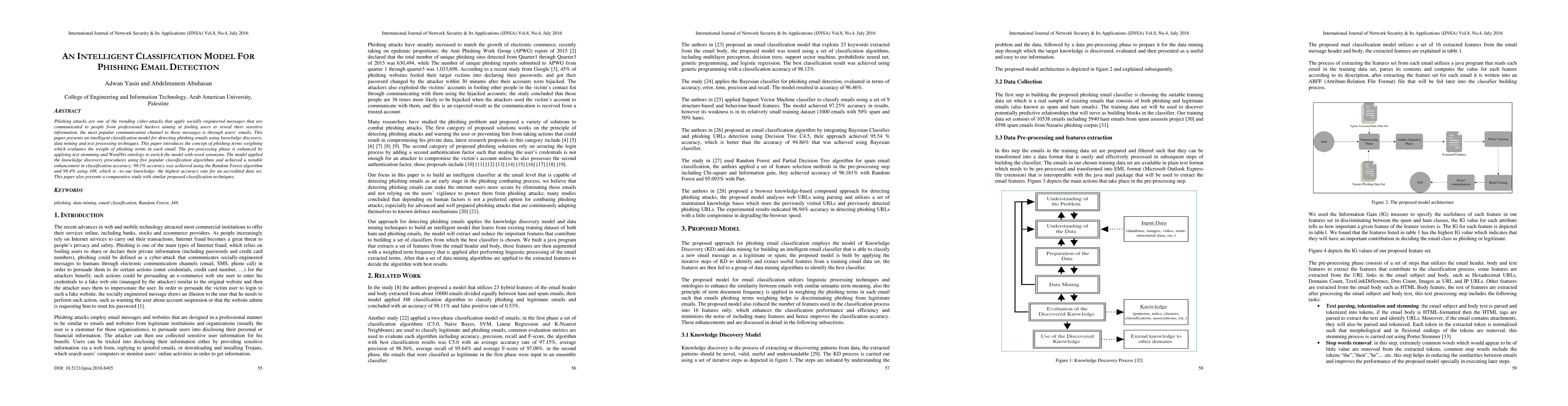This paper proposes an intelligent classification model for detecting phishing emails using data mining and text processing techniques, achieving 0.991 accuracy with the Random Forest algorithm, the highest reported accuracy for an accredited dataset. The model employs phishing terms weighting, text stemming, and WordNet ontology for enhanced preprocessing.