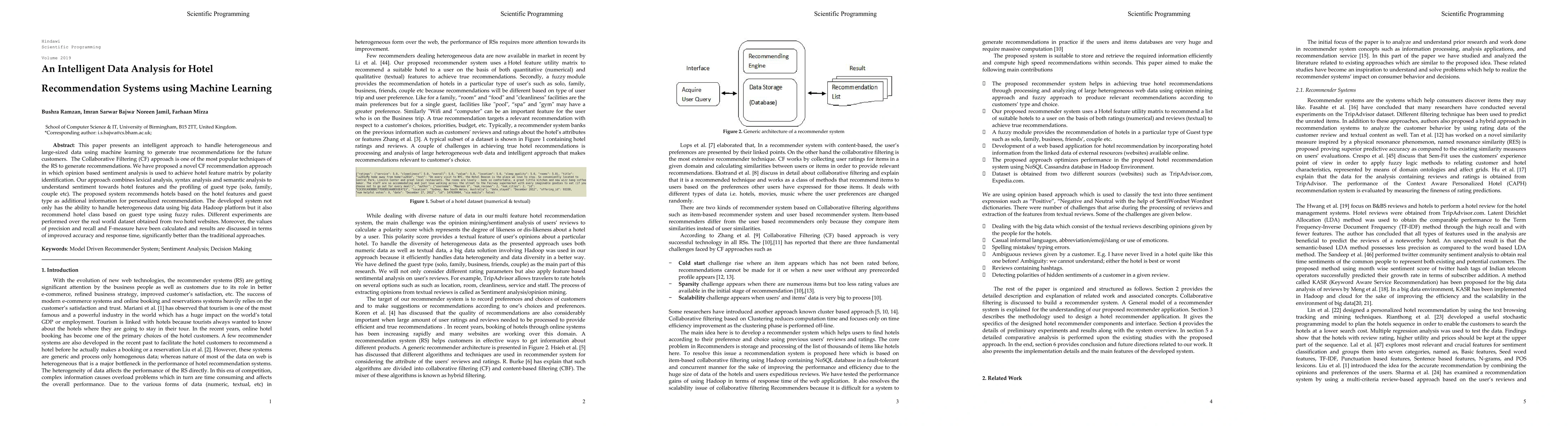 This paper presents an intelligent approach to handle heterogeneous and large-sized data using machine learning to generate true recommendations for the future customers. The Collaborative Filtering (CF) approach is one of the most popular techniques of the RS to generate recommendations. We have proposed a novel CF recommendation approach in which opinion based sentiment analysis is used to achieve hotel feature matrix by polarity identification. Our approach combines lexical analysis, syntax analysis and semantic analysis to understand sentiment towards hotel features and the profiling of guest type (solo, family, couple etc). The proposed system recommends hotels based on the hotel features and guest type as additional information for personalized recommendation. The developed system not only has the ability to handle heterogeneous data using big data Hadoop platform but it also recommend hotel class based on guest type using fuzzy rules. Different experiments are performed over the real world dataset obtained from two hotel websites. Moreover, the values of precision and recall and F-measure have been calculated and results are discussed in terms of improved accuracy and response time, significantly better than the traditional approaches.