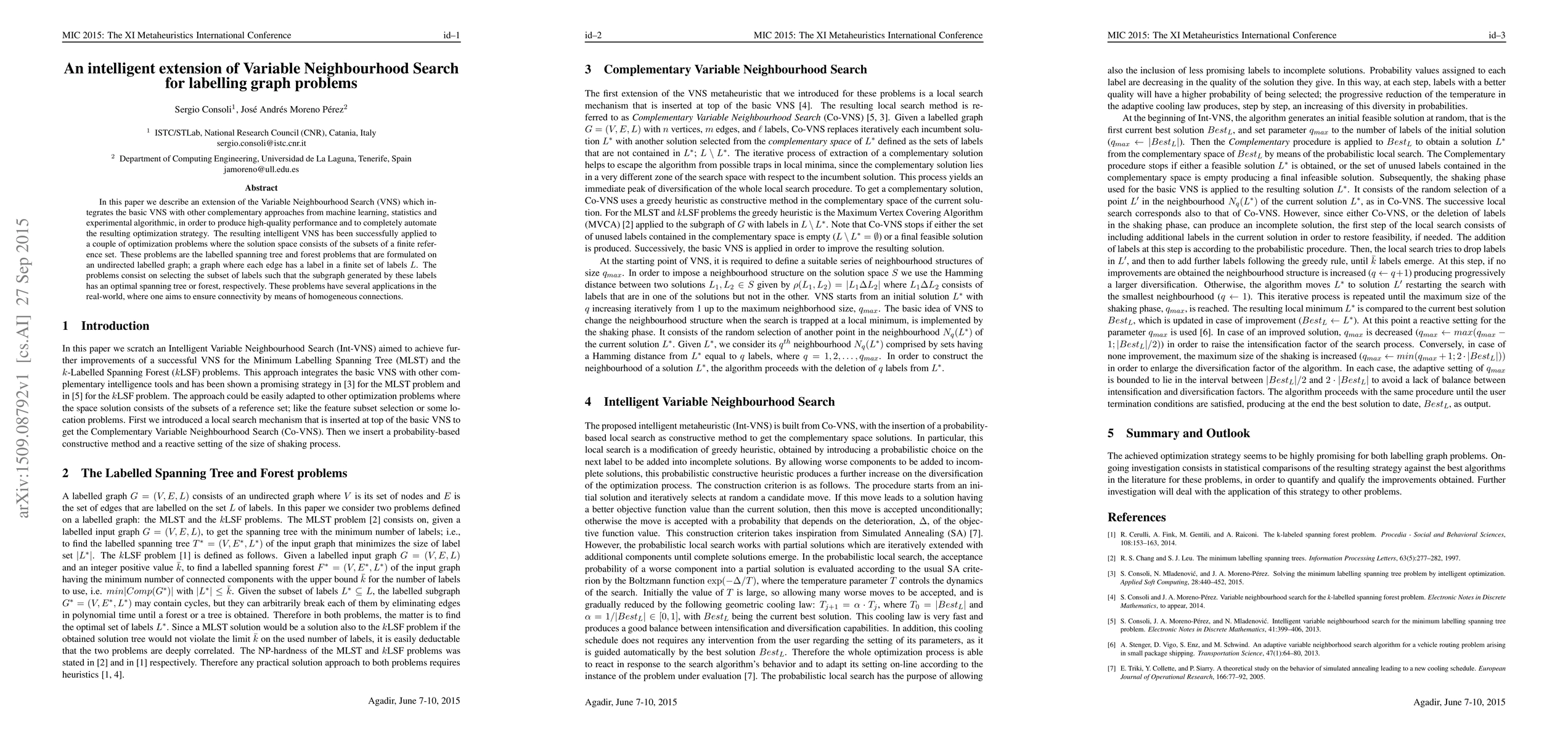 In this paper we describe an extension of the Variable Neighbourhood Search (VNS) which integrates the basic VNS with other complementary approaches from machine learning, statistics and experimental algorithmic, in order to produce high-quality performance and to completely automate the resulting optimization strategy. The resulting intelligent VNS has been successfully applied to a couple of optimization problems where the solution space consists of the subsets of a finite reference set. These problems are the labelled spanning tree and forest problems that are formulated on an undirected labelled graph; a graph where each edge has a label in a finite set of labels L. The problems consist on selecting the subset of labels such that the subgraph generated by these labels has an optimal spanning tree or forest, respectively. These problems have several applications in the real-world, where one aims to ensure connectivity by means of homogeneous connections.