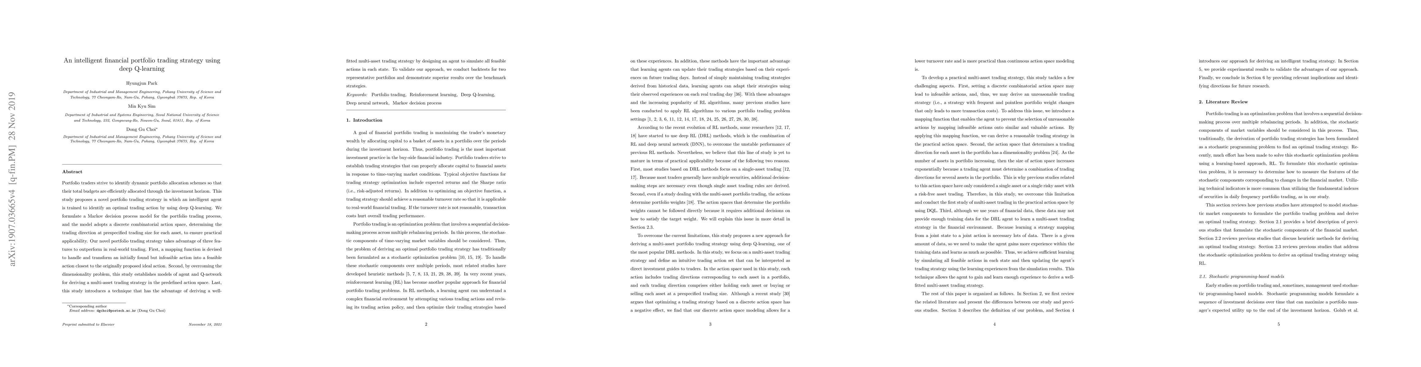 This paper proposes a deep Q-learning-based intelligent portfolio trading strategy that optimizes asset allocation through a Markov decision process. The strategy includes a mapping function to transform infeasible actions, a model to handle high-dimensionality, and a technique to simulate all feasible actions, achieving superior results in backtests compared to benchmark strategies.
