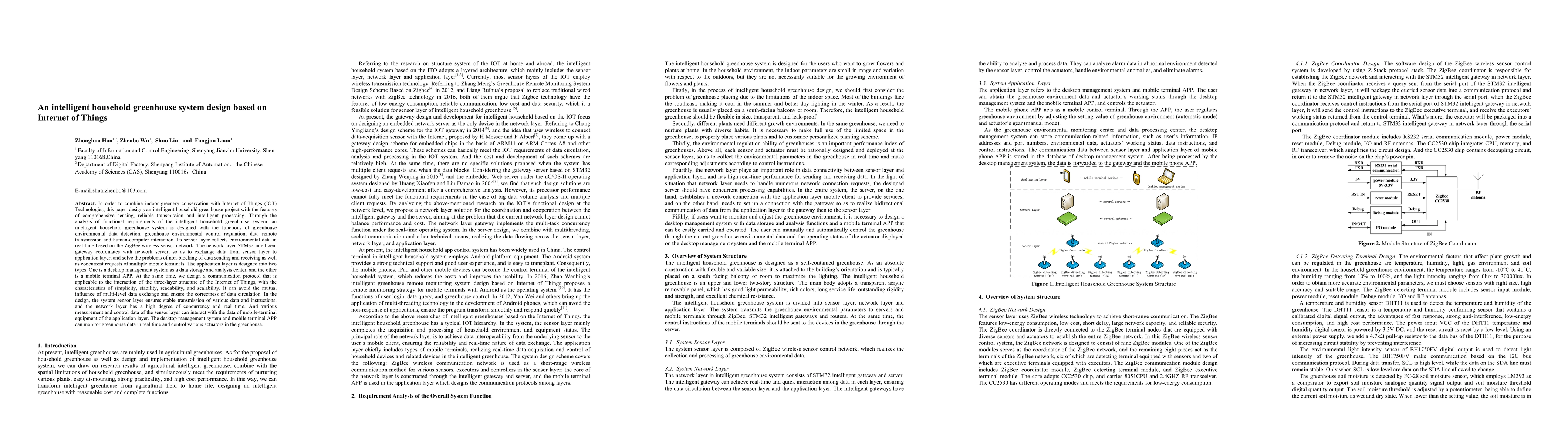In order to combine indoor greenery conservation with Internet of Things (IOT) Technologies, this paper designs an intelligent household greenhouse project with the features of comprehensive sensing, reliable transmission and intelligent processing. Through the analysis of functional requirements of the intelligent household greenhouse system, an intelligent household greenhouse system is designed with the functions of greenhouse environmental data detection, greenhouse environmental control regulation, data remote transmission and human-computer interaction. Its sensor layer collects environmental data in real time based on the ZigBee wireless sensor network. The network layer STM32 intelligent gateway coordinates with network server, so as to exchange data from sensor layer to application layer, and solve the problems of non-blocking of data sending and receiving as well as concurrent requests of multiple mobile terminals. The application layer is designed into two types. One is a desktop management system as a data storage and analysis center, and the other is a mobile terminal APP. At the same time, we design a communication protocol that is applicable to the interaction of the three-layer structure of the Internet of Things, with the characteristics of simplicity, stability, readability, and scalability. It can avoid the mutual influence of multi-level data exchange and ensure the correctness of data circulation. In the design, the system sensor layer ensures stable transmission of various data and instructions, and the network layer has a high degree of concurrency and real time. And various measurement and control data of the sensor layer can interact with the data of mobile-terminal equipment of the application layer. The desktop management system and mobile terminal APP can monitor greenhouse data in real time and control various actuators in the greenhouse.