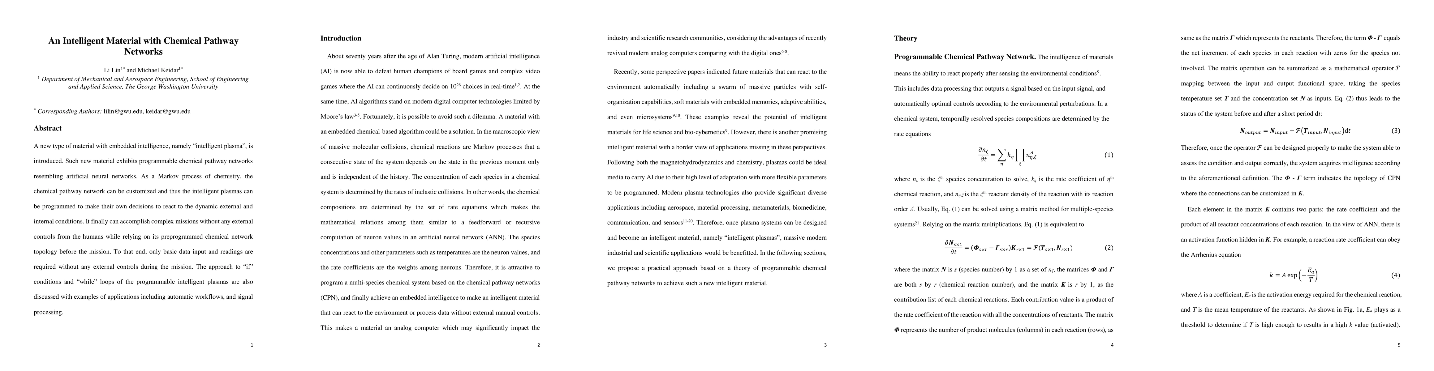 This paper introduces "intelligent plasma," a novel material with programmable chemical pathway networks akin to artificial neural networks, capable of autonomous decision-making based on pre-defined chemical network topologies. The material can execute complex tasks without external human intervention, utilizing basic data inputs and readings during its operations.