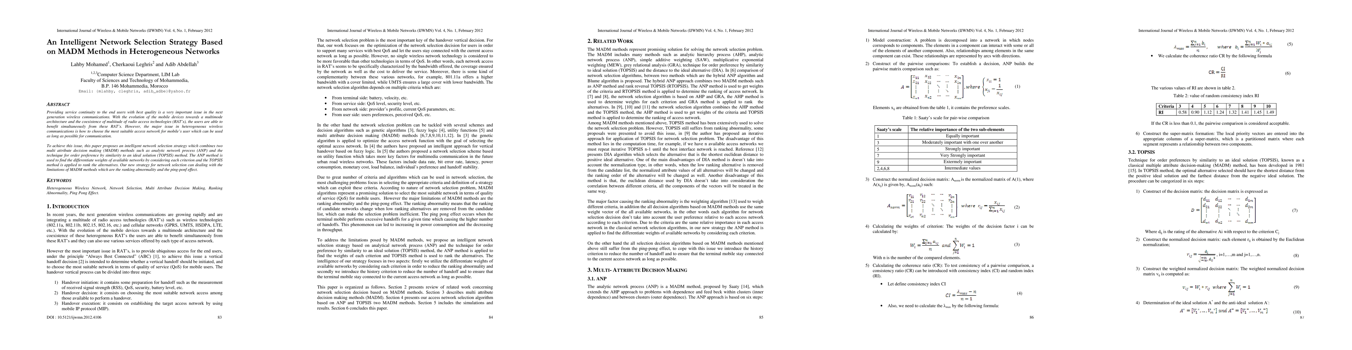 This paper proposes an intelligent network selection strategy using MADM methods to choose the best access network in heterogeneous wireless networks. It combines ANP for weight differentiation and TOPSIS for ranking, addressing MADM limitations like ranking abnormalities and ping-pong effect.