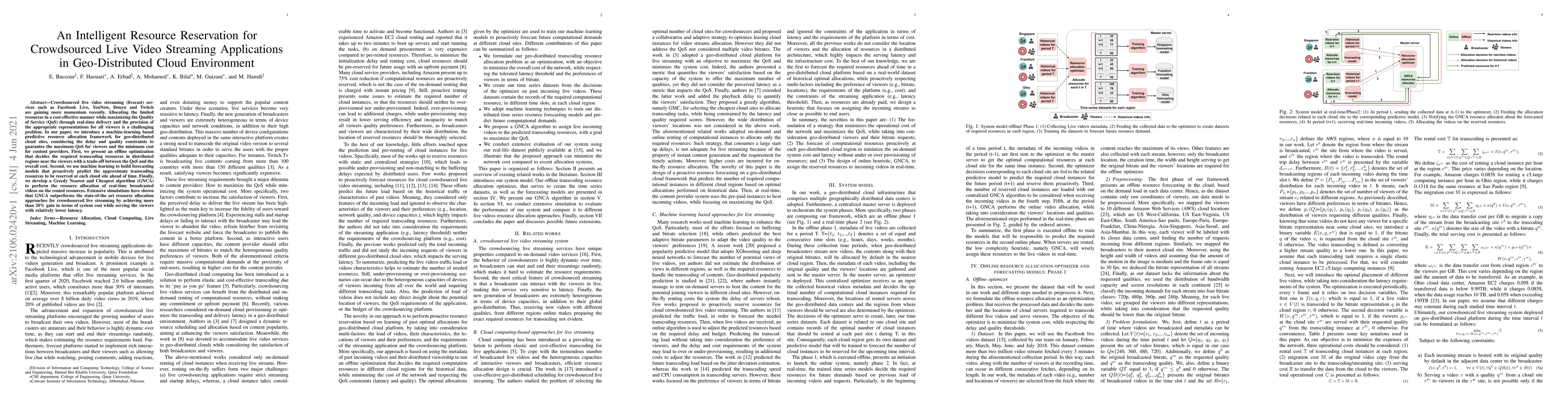 This paper proposes a machine-learning-based framework for optimizing resource allocation in geo-distributed cloud environments for crowdsourced live video streaming. It introduces an offline optimization and a Greedy Nearest and Cheapest algorithm (GNCA) that significantly reduces system costs by 20% while maintaining high QoS and lower latency.