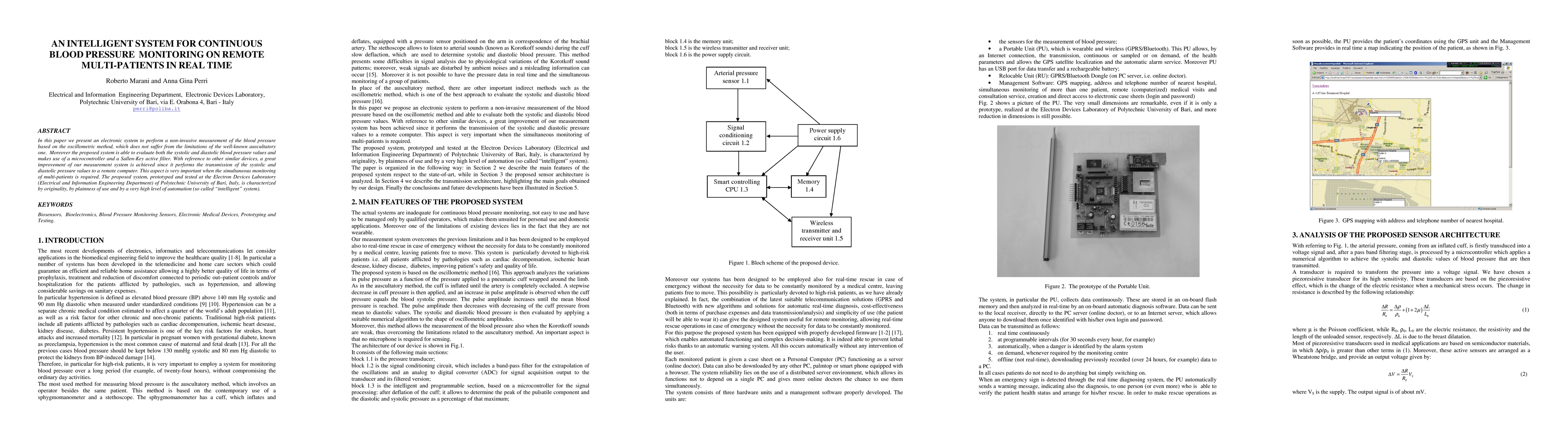In this paper we present an electronic system to perform a non-invasive measurement of the blood pressure based on the oscillometric method, which does not suffer from the limitations of the well-known auscultatory one. Moreover the proposed system is able to evaluate both the systolic and diastolic blood pressure values and makes use of a microcontroller and a Sallen-Key active filter. With reference to other similar devices, a great improvement of our measurement system is achieved since it performs the transmission of the systolic and diastolic pressure values to a remote computer. This aspect is very important when the simultaneous monitoring of multi-patients is required. The proposed system, prototyped and tested at the Electron Devices Laboratory (Electrical and Information Engineering Department) of Polytechnic University of Bari, Italy, is characterized by originality, by plainness of use and by a very high level of automation (so called intelligent system).