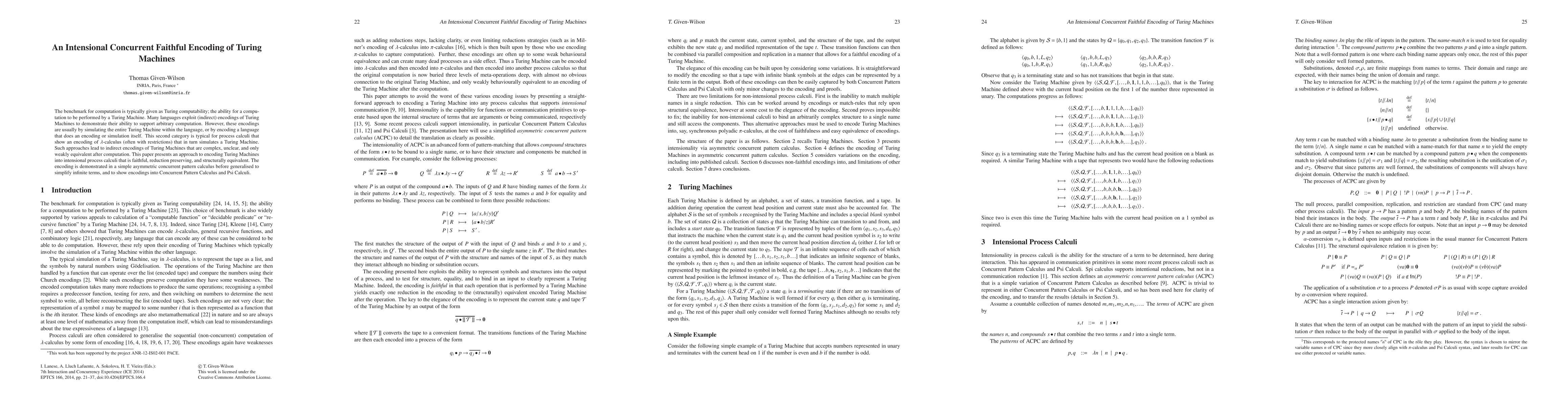 The benchmark for computation is typically given as Turing computability; the ability for a computation to be performed by a Turing Machine. Many languages exploit (indirect) encodings of Turing Machines to demonstrate their ability to support arbitrary computation. However, these encodings are usually by simulating the entire Turing Machine within the language, or by encoding a language that does an encoding or simulation itself. This second category is typical for process calculi that show an encoding of lambda-calculus (often with restrictions) that in turn simulates a Turing Machine. Such approaches lead to indirect encodings of Turing Machines that are complex, unclear, and only weakly equivalent after computation. This paper presents an approach to encoding Turing Machines into intensional process calculi that is faithful, reduction preserving, and structurally equivalent. The encoding is demonstrated in a simple asymmetric concurrent pattern calculus before generalised to simplify infinite terms, and to show encodings into Concurrent Pattern Calculus and Psi Calculi.