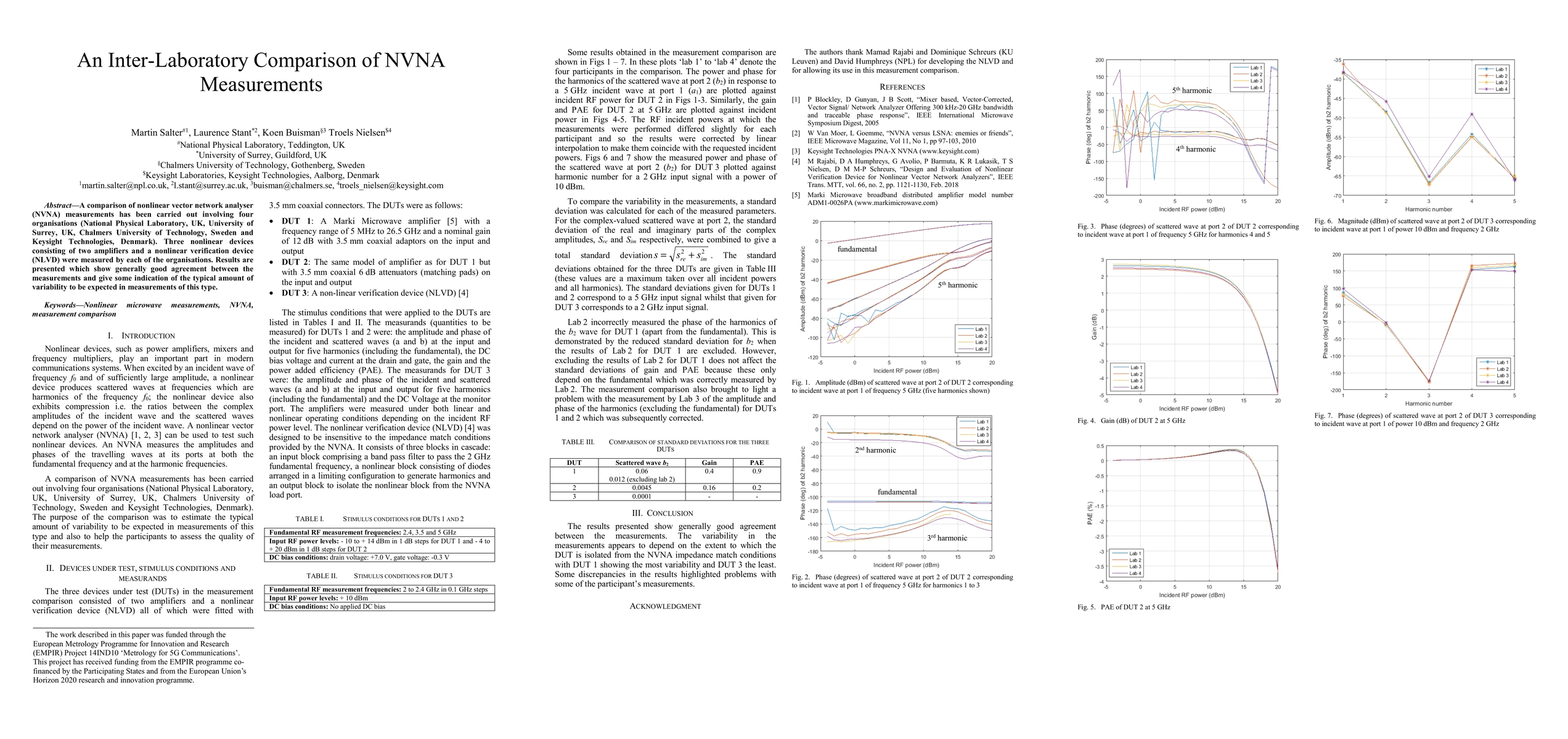 A comparison of nonlinear vector network analyser (NVNA) measurements has been carried out involving four organisations (National Physical Laboratory, UK, University of Surrey, UK, Chalmers University of Technology, Sweden and Keysight Technologies, Denmark). Three nonlinear devices consisting of two amplifiers and a nonlinear verification device (NLVD) were measured by each of the organisations. Results are presented which show generally good agreement between the measurements and give some indication of the typical amount of variability to be expected in measurements of this type.