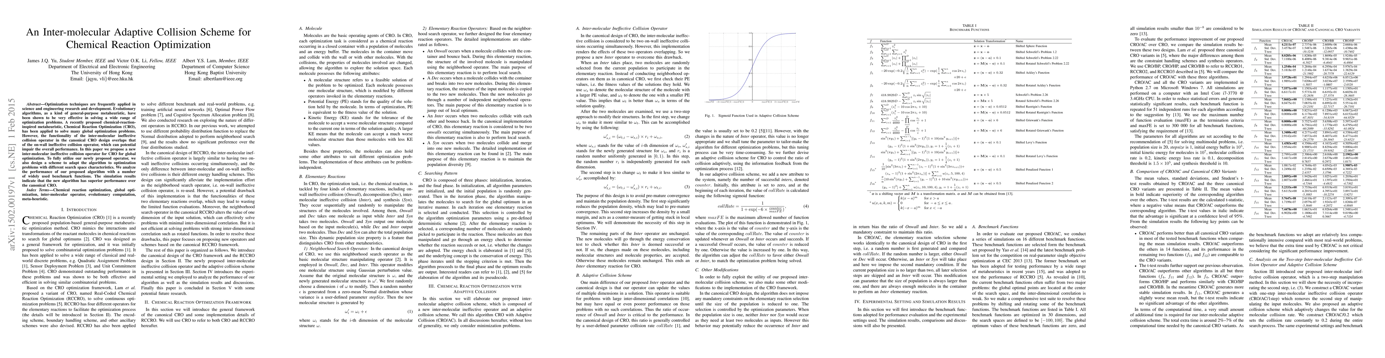 This paper proposes a new inter-molecular ineffective collision operator for the Chemical Reaction Optimization (CRO) algorithm to enhance its performance. It also introduces an adaptive scheme to tailor the algorithm to different optimization problems, demonstrating superior results over the canonical CRO on benchmark functions.
