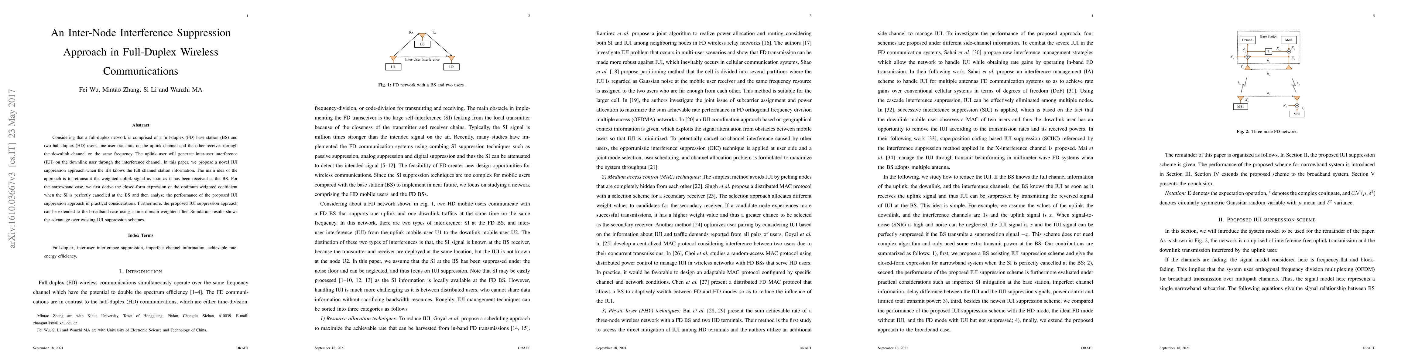 This paper proposes a novel interference suppression approach for full-duplex wireless communications, focusing on mitigating inter-user interference (IUI) in a network with a full-duplex base station and two half-duplex users. The approach involves retransmitting a weighted uplink signal to cancel out interference, with a derived closed-form expression for the optimal weight coefficient in narrowband scenarios.