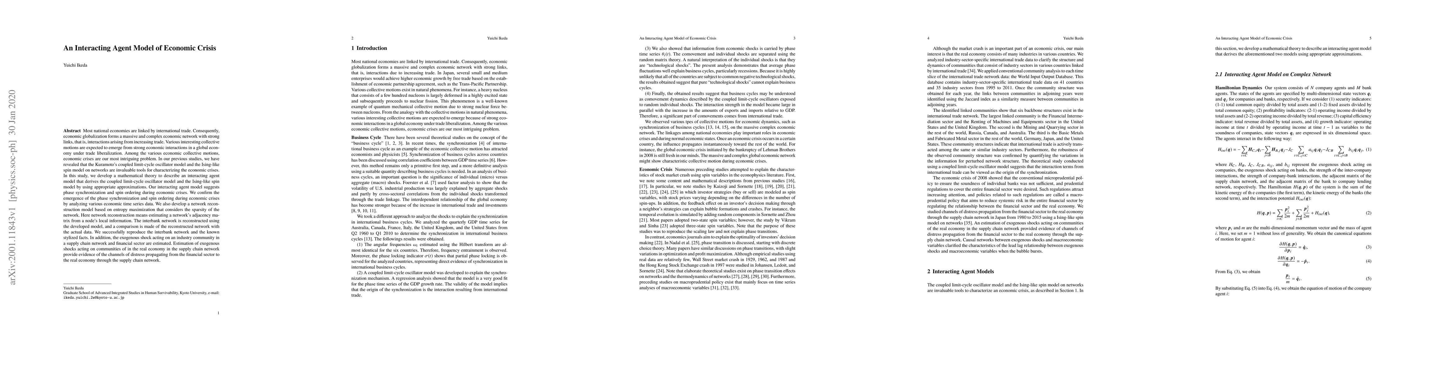 Most national economies are linked by international trade. Consequently, economic globalization forms a massive and complex economic network with strong links, that is, interactions arising from increasing trade. Various interesting collective motions are expected to emerge from strong economic interactions in a global economy under trade liberalization. Among the various economic collective motions, economic crises are our most intriguing problem. In our previous studies, we have revealed that the Kuramoto's coupled limit-cycle oscillator model and the Ising-like spin model on networks are invaluable tools for characterizing the economic crises. In this study, we develop a mathematical theory to describe an interacting agent model that derives the Kuramoto model and the Ising-like spin model by using appropriate approximations. Our interacting agent model suggests phase synchronization and spin ordering during economic crises. We confirm the emergence of the phase synchronization and spin ordering during economic crises by analyzing various economic time series data. We also develop a network reconstruction model based on entropy maximization that considers the sparsity of the network. Here network reconstruction means estimating a network's adjacency matrix from a node's local information. The interbank network is reconstructed using the developed model, and a comparison is made of the reconstructed network with the actual data. We successfully reproduce the interbank network and the known stylized facts. In addition, the exogenous shock acting on an industry community in a supply chain network and financial sector are estimated. Estimation of exogenous shocks acting on communities of in the real economy in the supply chain network provide evidence of the channels of distress propagating from the financial sector to the real economy through the supply chain network.