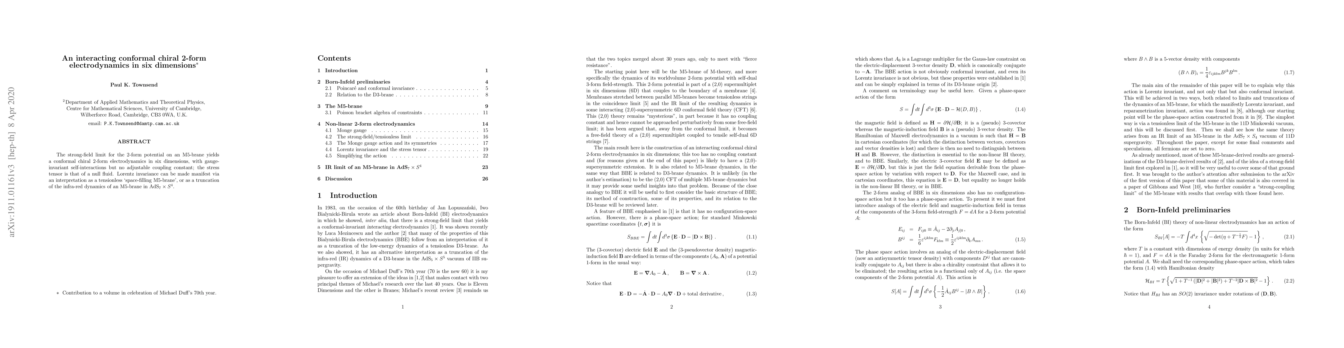 The strong-field limit for the 2-form potential on an M5-brane yields a conformal chiral 2-form electrodynamics in six dimensions, with gauge-invariant self-interactions but no adjustable coupling constant; the stress tensor is that of a null fluid. Lorentz invariance can be made manifest via an interpretation as a tensionless `space-filling M5-brane', or as a truncation of the infra-red dynamics of an M5-brane in AdS7 x S4.