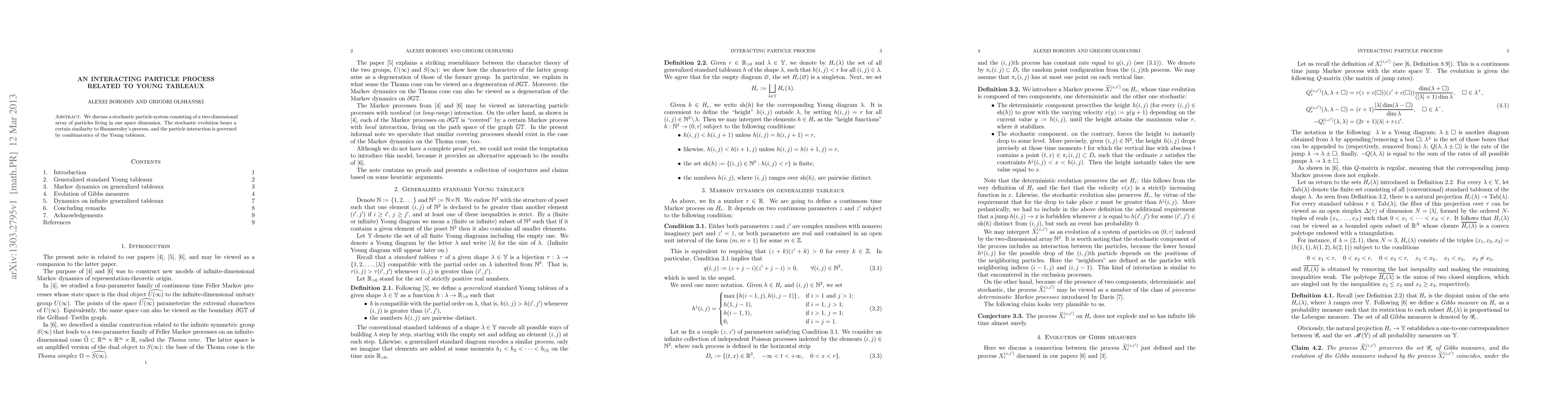 Summary: This paper explores a stochastic particle system where particles interact based on the combinatorics of Young tableaux, resembling Hammersley's process, and evolves in a two-dimensional array with one-dimensional space.