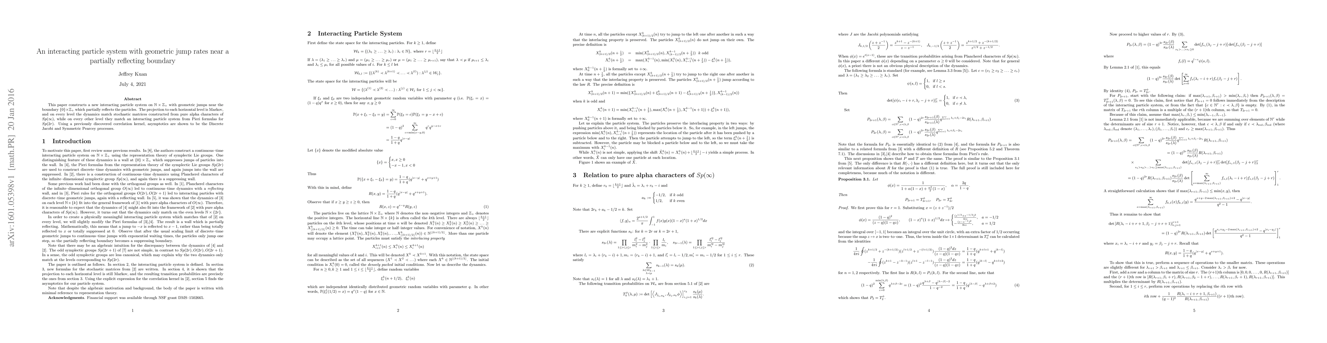 This paper constructs a new interacting particle system on a two--dimensional lattice with geometric jumps near a boundary which partially reflects the particles. The projection to each horizontal level is Markov, and on every level the dynamics match stochastic matrices constructed from pure alpha characters of $Sp(\infty)$, while on every other level they match an interacting particle system from Pieri formulas for $Sp(2r)$. Using a previously discovered correlation kernel, asymptotics are shown to be the Discrete Jacobi and Symmetric Pearcey processes.