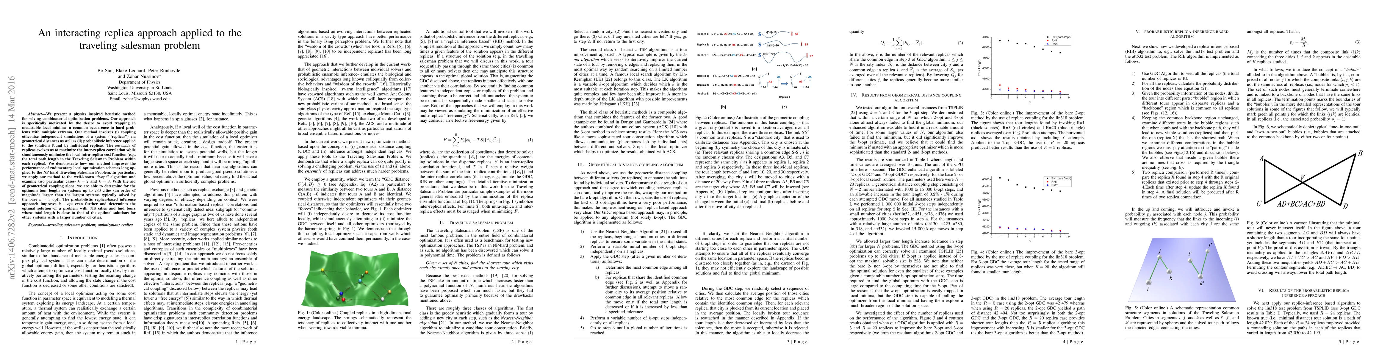 This paper introduces a physics-inspired heuristic method for solving the Traveling Salesman Problem, coupling independent simulations (replicas) to avoid local minima and applying probabilistic inference to enhance solution quality. The method significantly improves the performance of the $k$-opt algorithm, determining optimal tours for systems up to 318 cities.