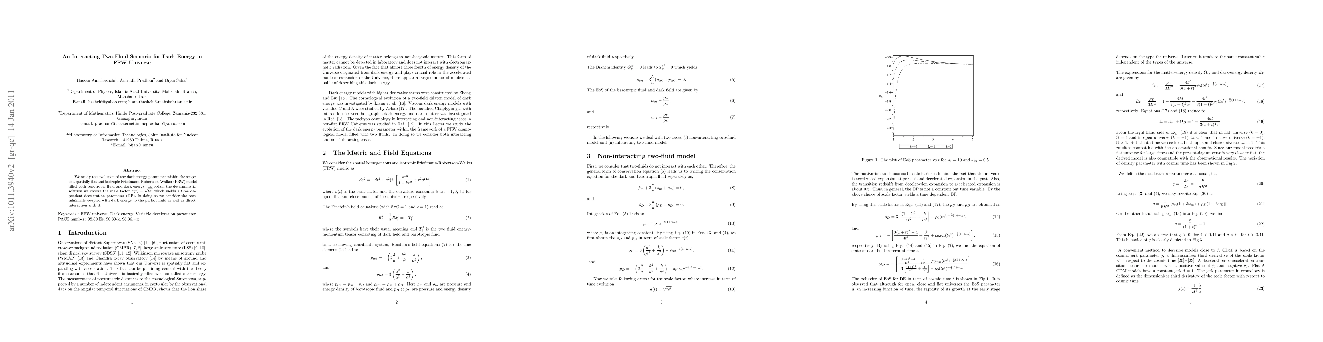 This paper explores the evolution of dark energy in a flat, isotropic FRW universe, considering both minimal coupling and direct interaction with a barotropic fluid. The chosen scale factor $a(t) = \sqrt{t e^{t}}$ provides a time-dependent deceleration parameter, offering insights into the dynamics of dark energy.