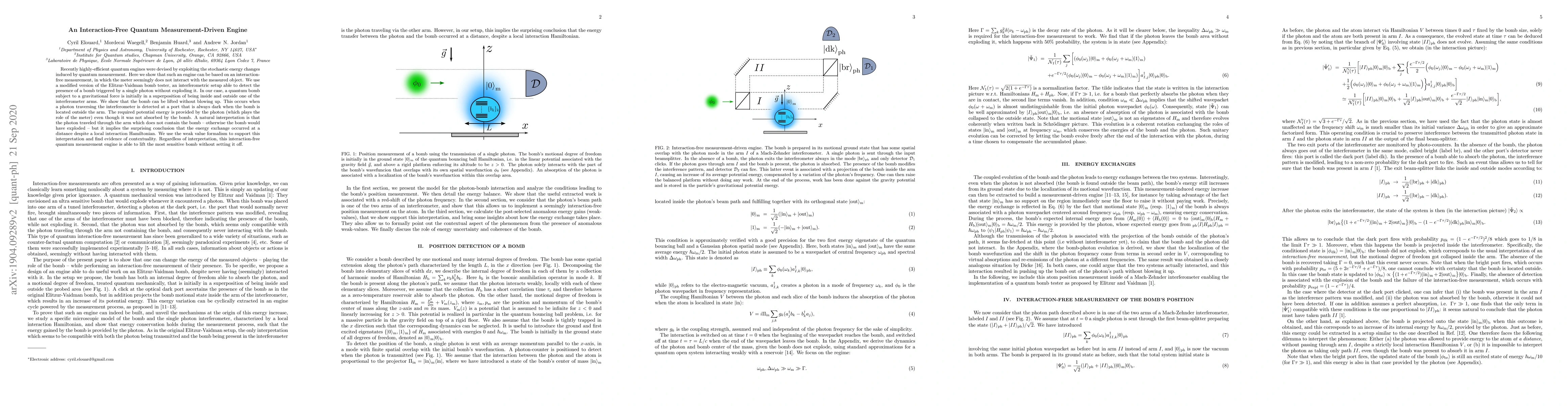 This paper proposes a highly efficient quantum engine based on an interaction-free measurement, demonstrating that energy changes can be harnessed without direct interaction between the meter and the measured object. The engine utilizes a modified Elitzur-Vaidman bomb tester to lift a quantum bomb without triggering it, supported by the weak value formalism and revealing contextuality.