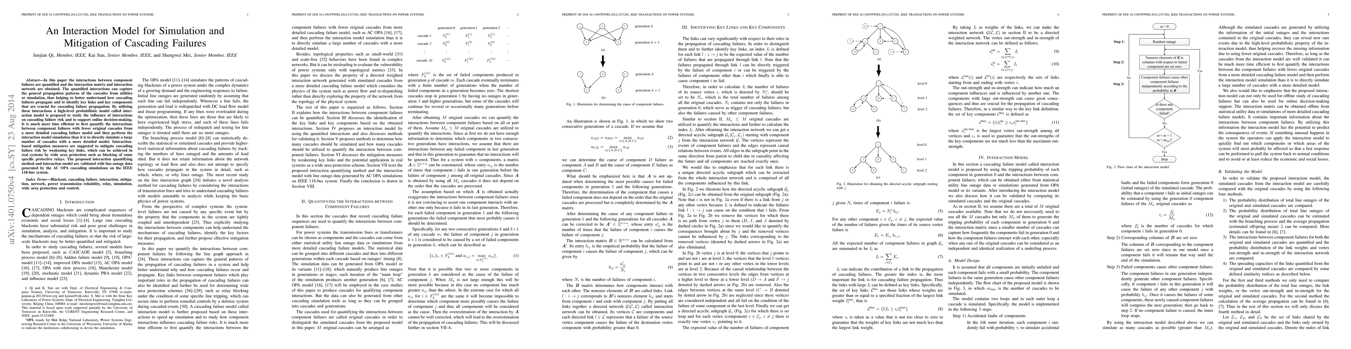This paper proposes an interaction model to quantify and simulate cascading failures by analyzing component failure interactions, aiming to identify critical links and components for risk mitigation. The model enhances decision-making efficiency and suggests mitigation strategies like blocking specific protective relays to reduce failure risk.