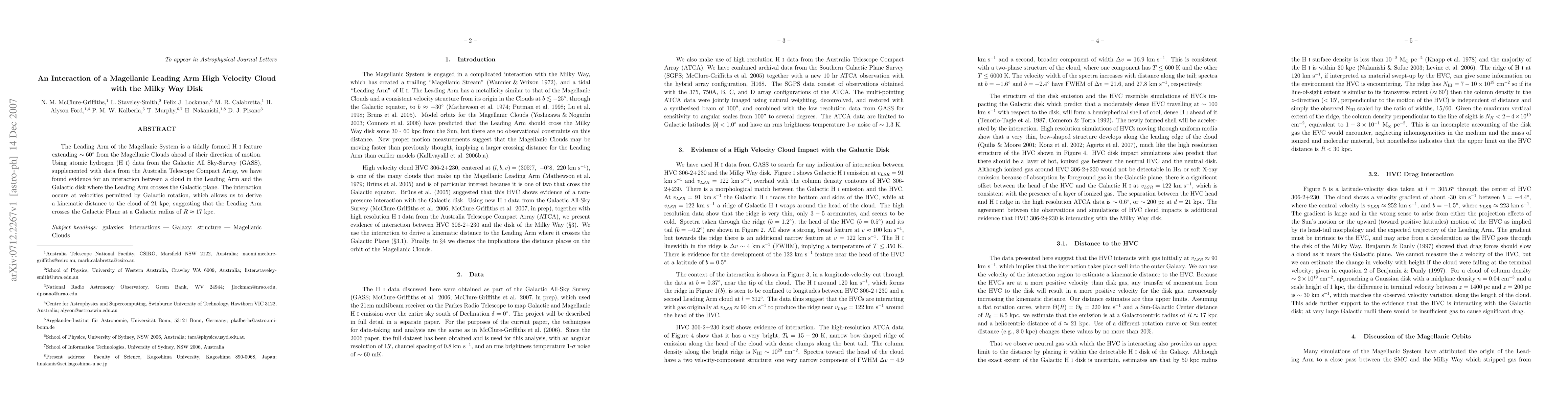 The Leading Arm of the Magellanic System is a tidally formed HI feature extending $\sim 60\arcdeg$ from the Magellanic Clouds ahead of their direction of motion. Using atomic hydrogen (HI) data from the Galactic All Sky-Survey (GASS), supplemented with data from the Australia Telescope Compact Array, we have found evidence for an interaction between a cloud in the Leading Arm and the Galactic disk where the Leading Arm crosses the Galactic plane. The interaction occurs at velocities permitted by Galactic rotation, which allows us to derive a kinematic distance to the cloud of 21 kpc, suggesting that the Leading Arm crosses the Galactic Plane at a Galactic radius of $R\approx 17$ kpc.