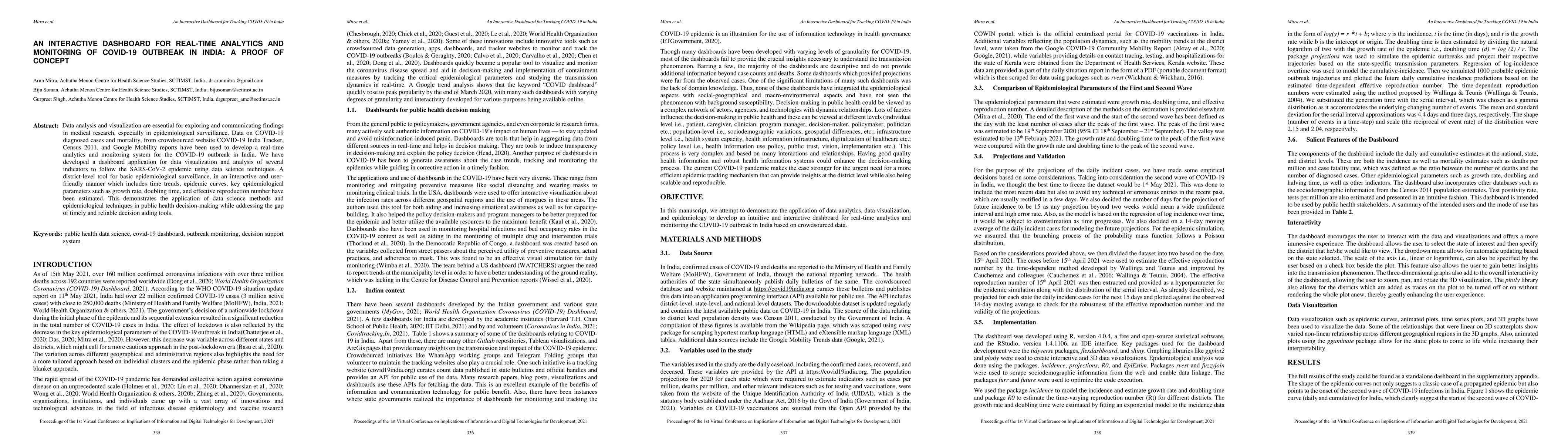 The paper presents a real-time analytics dashboard for COVID-19 in India, using crowdsourced and official data sources to visualize and monitor key epidemiological indicators like growth rate and effective reproduction number at the district level. It highlights the application of data science methods for timely public health decision-making.