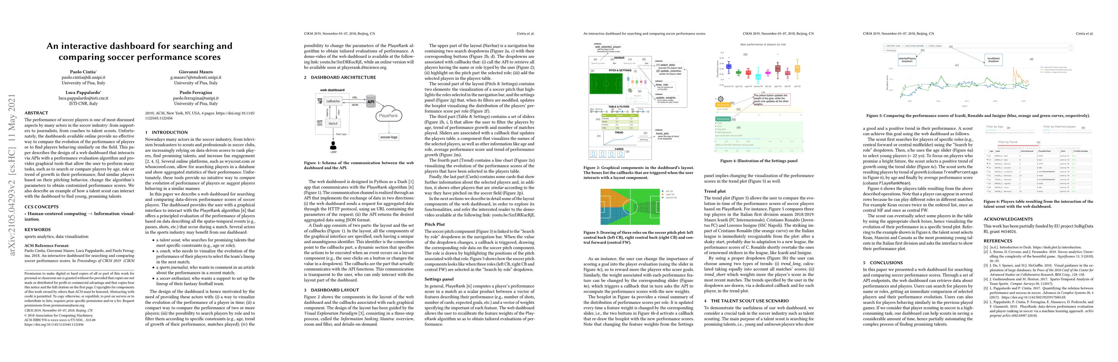 The performance of soccer players is one of most discussed aspects by many actors in the soccer industry: from supporters to journalists, from coaches to talent scouts. Unfortunately, the dashboards available online provide no effective way to compare the evolution of the performance of players or to find players behaving similarly on the field. This paper describes the design of a web dashboard that interacts via APIs with a performance evaluation algorithm and provides graphical tools that allow the user to perform many tasks, such as to search or compare players by age, role or trend of growth in their performance, find similar players based on their pitching behavior, change the algorithm's parameters to obtain customized performance scores. We also describe an example of how a talent scout can interact with the dashboard to find young, promising talents.