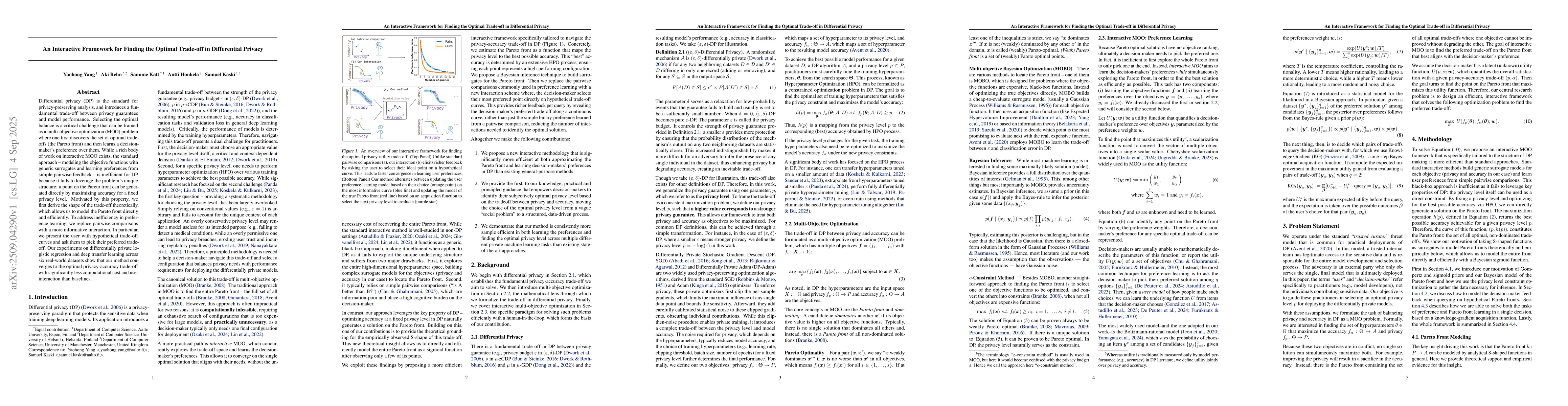 Differential privacy (DP) is the standard for privacy-preserving analysis, and introduces a fundamental trade-off between privacy guarantees and model performance. Selecting the optimal balance is a critical challenge that can be framed as a multi-objective optimization (MOO) problem where one first discovers the set of optimal trade-offs (the Pareto front) and then learns a decision-maker's preference over them. While a rich body of work on interactive MOO exists, the standard approach -- modeling the objective functions with generic surrogates and learning preferences from simple pairwise feedback -- is inefficient for DP because it fails to leverage the problem's unique structure: a point on the Pareto front can be generated directly by maximizing accuracy for a fixed privacy level. Motivated by this property, we first derive the shape of the trade-off theoretically, which allows us to model the Pareto front directly and efficiently. To address inefficiency in preference learning, we replace pairwise comparisons with a more informative interaction. In particular, we present the user with hypothetical trade-off curves and ask them to pick their preferred trade-off. Our experiments on differentially private logistic regression and deep transfer learning across six real-world datasets show that our method converges to the optimal privacy-accuracy trade-off with significantly less computational cost and user interaction than baselines.