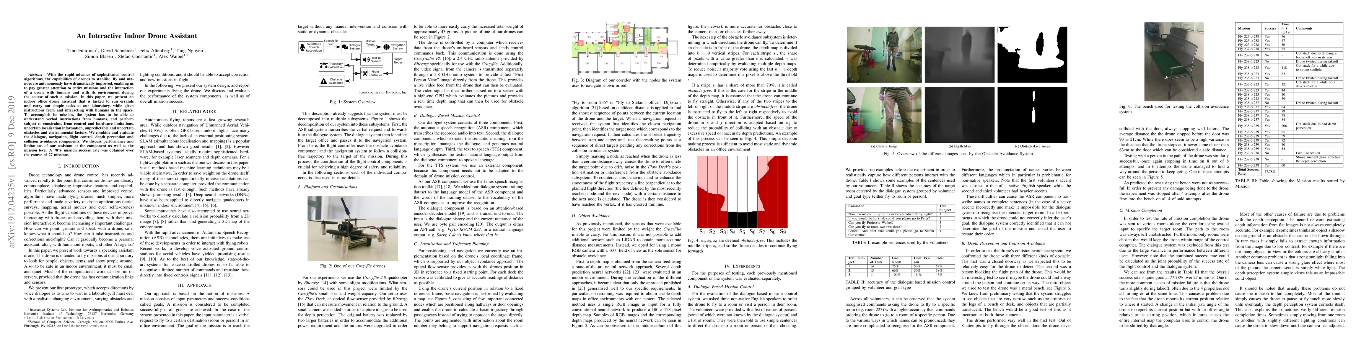 This paper introduces an indoor drone assistant designed to perform errands and tasks in an office environment, focusing on its ability to interact with humans and navigate complex environments. The system integrates dialogue, navigation, and collision avoidance, achieving a 78% mission success rate over 27 trials.