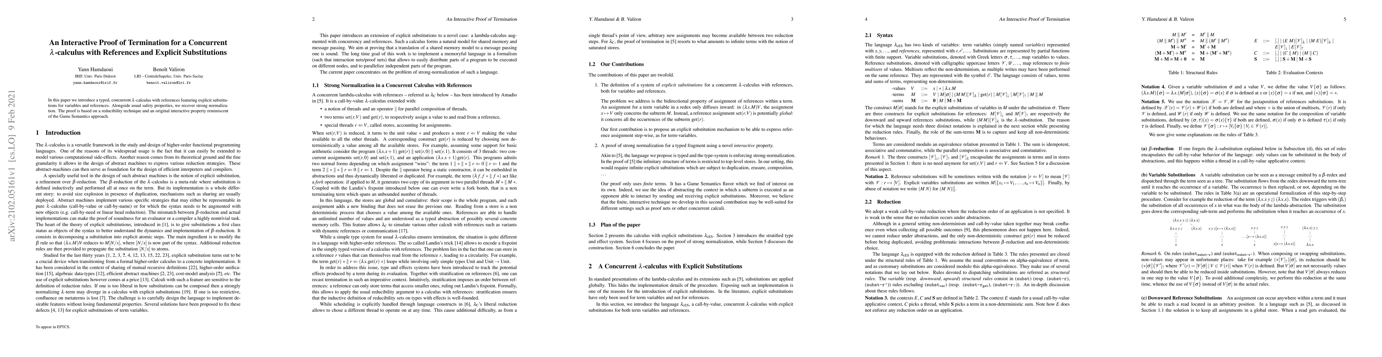 This paper introduces a typed concurrent λ-calculus with references featuring explicit substitutions, recovering strong normalization through an interactive proof technique based on reducibility.