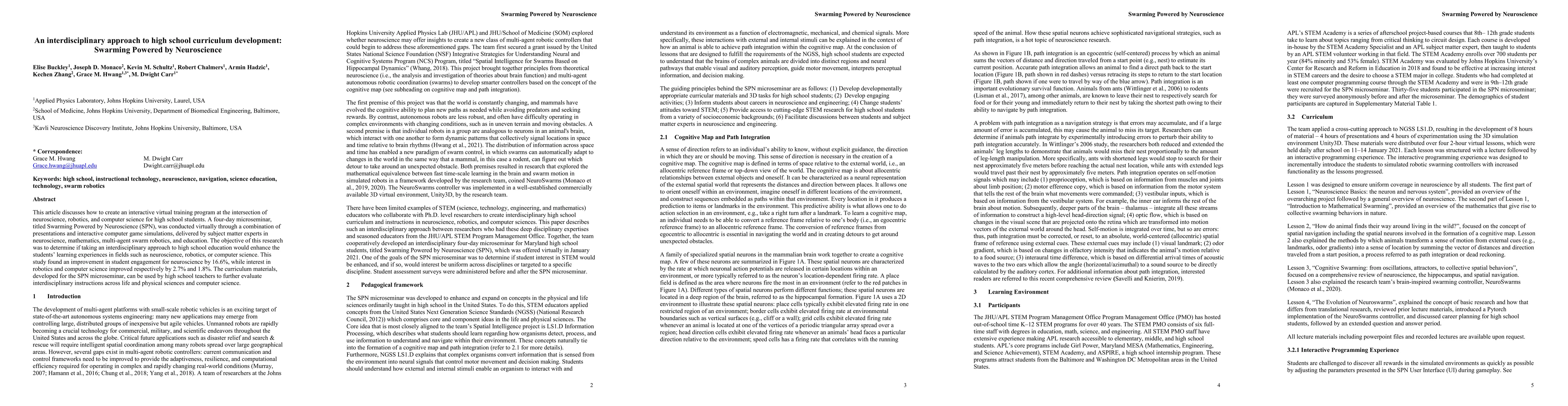 This article discusses how to create an interactive virtual training program at the intersection of neuroscience, robotics, and computer science for high school students. A four-day microseminar, titled Swarming Powered by Neuroscience (SPN), was conducted virtually through a combination of presentations and interactive computer game simulations, delivered by subject matter experts in neuroscience, mathematics, multi-agent swarm robotics, and education. The objective of this research was to determine if taking an interdisciplinary approach to high school education would enhance the students learning experiences in fields such as neuroscience, robotics, or computer science. This study found an improvement in student engagement for neuroscience by 16.6%, while interest in robotics and computer science improved respectively by 2.7% and 1.8%. The curriculum materials, developed for the SPN microseminar, can be used by high school teachers to further evaluate interdisciplinary instructions across life and physical sciences and computer science.