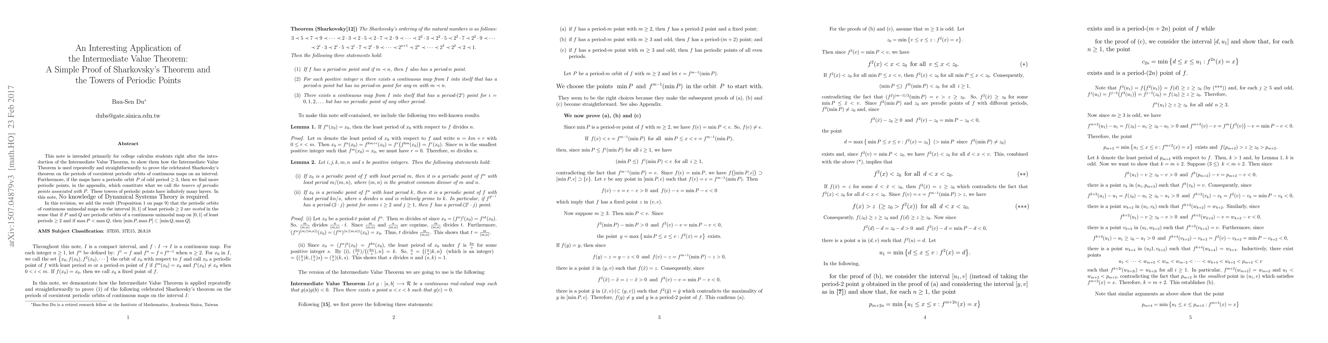 This note is intended primarily for college calculus students right after the introduction of the Intermediate Value Theorem, to show them how the Intermediate Value Theorem is used repeatedly and straightforwardly to prove the celebrated Sharkovsky's theorem on the periods of coexistent periodic orbits of continuous maps on an interval. Furthermore, if the maps have a periodic orbit P of odd period > 1, then we find more periodic points, in the appendix, which constitute what we call the towers of periodic points associated with P. These towers of periodic points have infinitely many layers. In this note, no knowledge of Dynamical Systems Theory is required. In this revision, we add the result (Proposition 1 on page 9) that the periodic orbits of continuous unimodal maps on the interval $[0, 1]$ of least periods $\ge 2$ are nested in the sense that if $P$ and $Q$ are periodic orbits of a continuous unimodal map on $[0, 1]$ of least periods $\ge 2$ and if $\max P < \max Q$, then $[\min P, \max P] \subset [\min Q, \max Q]$.