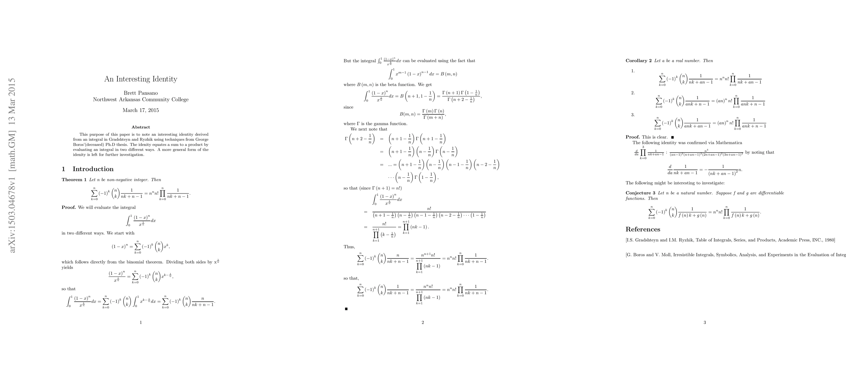 This purpose of this paper is to note an interesting identity derived from an integral in Gradshteyn and Ryzhik using techniques from George Boros'(deceased) Ph.D thesis. The idenity equates a sum to a product by evaluating an integral in two different ways. A more general form of the idenity is left for further investigation.