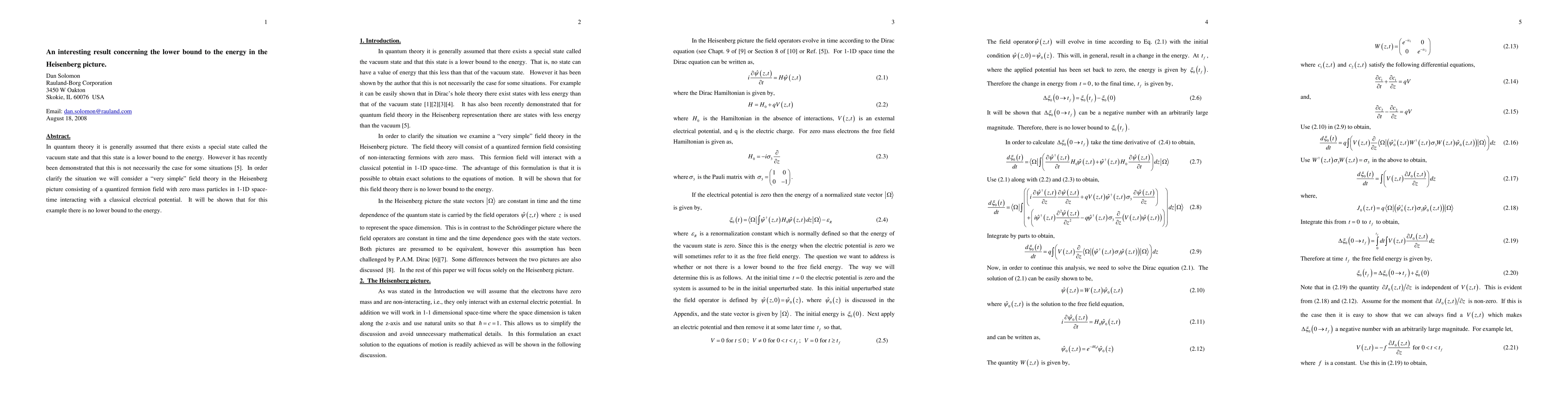 In quantum theory it is generally assumed that there exists a special state called the vacuum state and that this state is a lower bound to the energy. However it has recently been demonstrated that this is not necessarily the case for some situations [5]. In order to clarify the situation we will consider a "very simple" field theory in the Heisenberg picture consisting of a quanitized fermion field with zero mass pariticles in 1-1D space-time interacting with a classical electrical potential. It will be shown that for this example there is no lower bound to the energy.