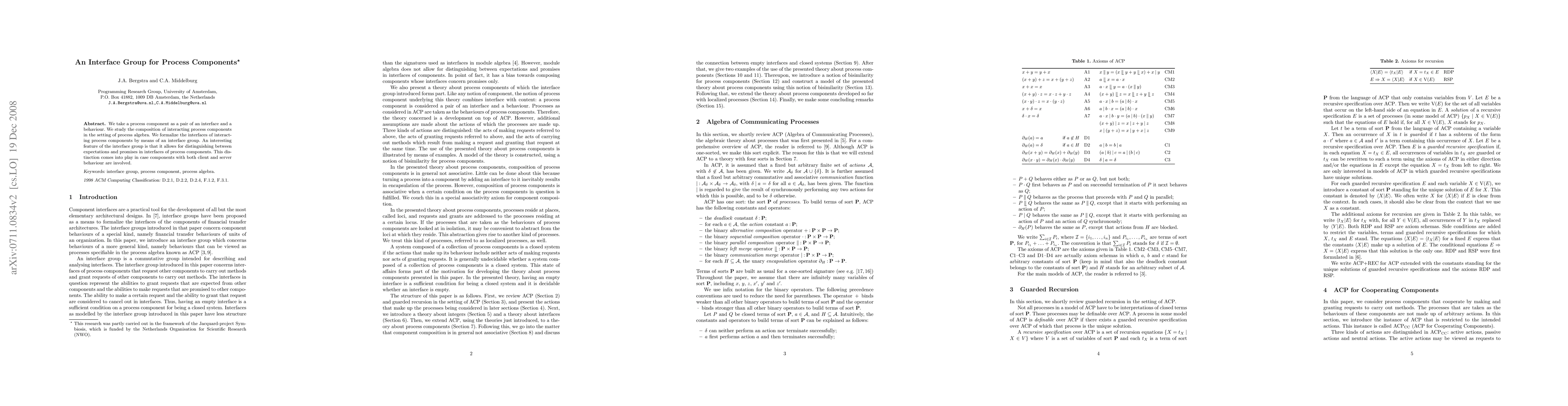 We take a process component as a pair of an interface and a behaviour. We study the composition of interacting process components in the setting of process algebra. We formalize the interfaces of interacting process components by means of an interface group. An interesting feature of the interface group is that it allows for distinguishing between expectations and promises in interfaces of process components. This distinction comes into play in case components with both client and server behaviour are involved.