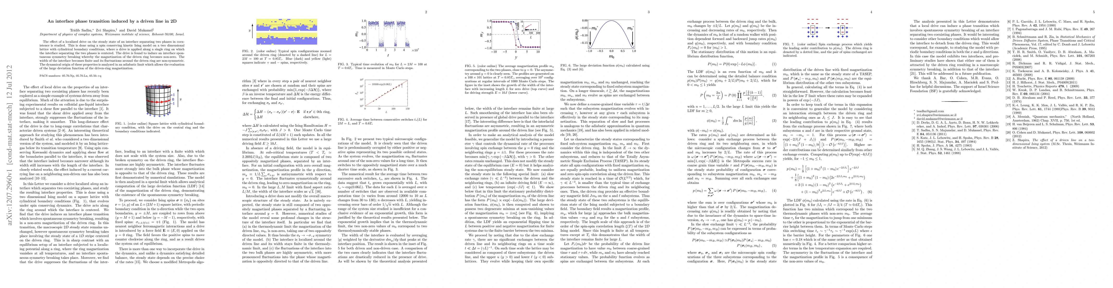 The effect of a localized drive on the steady state of an interface separating two phases in coexistence is studied. This is done using a spin conserving kinetic Ising model on a two dimensional lattice with cylindrical boundary conditions, where a drive is applied along a single ring on which the interface separating the two phases is centered. The drive is found to induce an interface spontaneous symmetry breaking whereby the magnetization of the driven ring becomes non-zero. The width of the interface becomes finite and its fluctuations around the driven ring are non-symmetric. The dynamical origin of these properties is analyzed in an adiabatic limit which allows the evaluation of the large deviation function of the driven-ring magnetization.