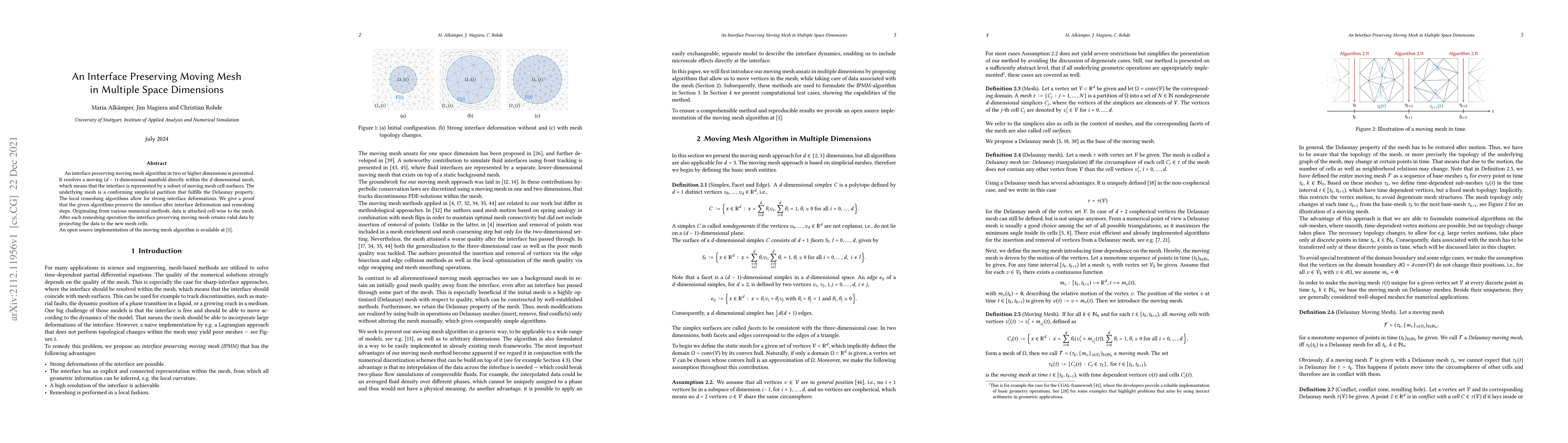 An interface preserving moving mesh algorithm in two or higher dimensions is presented. It resolves a moving $(d-1)$-dimensional manifold directly within the $d$-dimensional mesh, which means that the interface is represented by a subset of moving mesh cell-surfaces. The underlying mesh is a conforming simplicial partition that fulfills the Delaunay property. The local remeshing algorithms allow for strong interface deformations. We give a proof that the given algorithms preserve the interface after interface deformation and remeshing steps. Originating from various numerical methods, data is attached cell-wise to the mesh. After each remeshing operation the interface preserving moving mesh retains valid data by projecting the data to the new mesh cells.\newline An open source implementation of the moving mesh algorithm is available at [1].