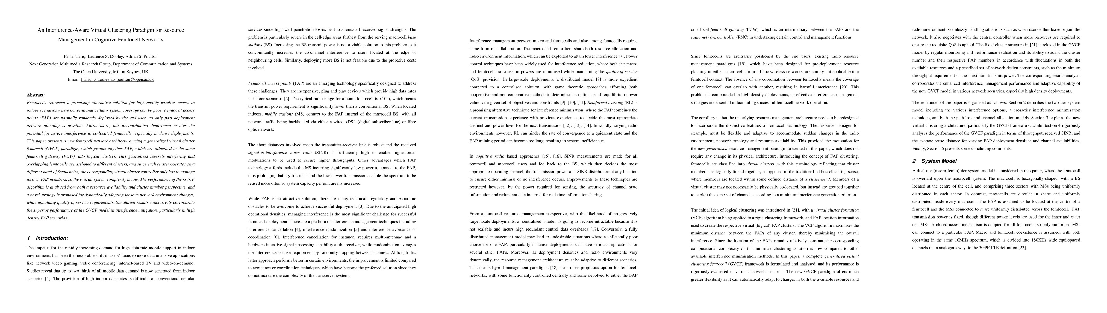 This paper introduces a virtual clustering paradigm for cognitive femtocell networks to manage interference and resource allocation. The generalized virtual cluster femtocell (GVCF) model groups femtocell access points into clusters operating on different frequencies, reducing interference and simplifying management. Simulation results show the GVCF model's effectiveness in interference mitigation and resource optimization in dense femtocell deployments.