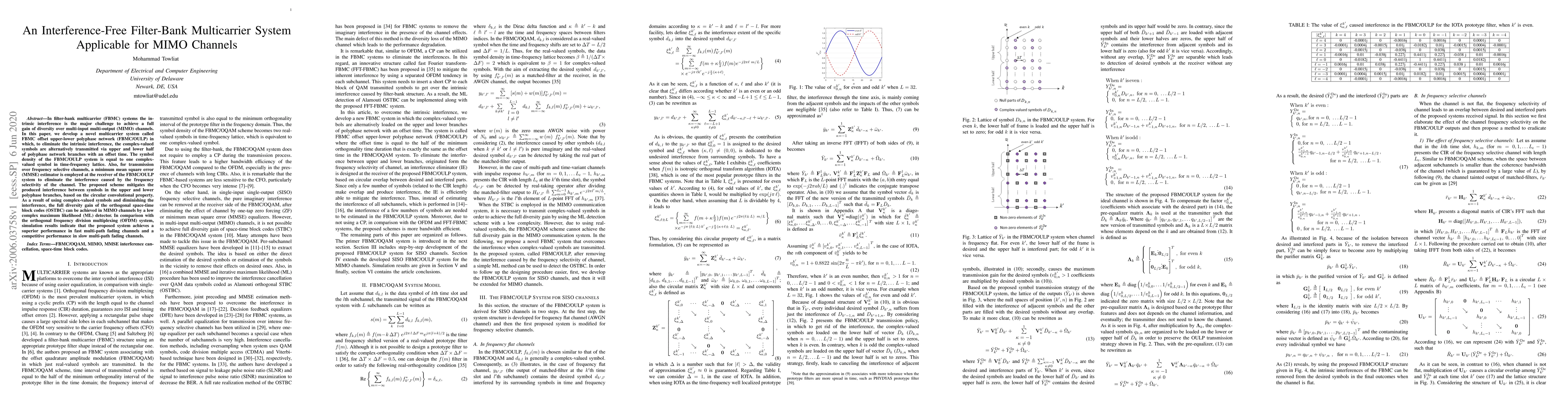 This paper proposes a novel FBMC/OULP system to eliminate interference in filter-bank multicarrier systems for MIMO channels, achieving full diversity gain through complex-valued symbol transmission and a MMSE estimator. Compared to OFDM, it shows superior performance in fast fading channels.
